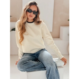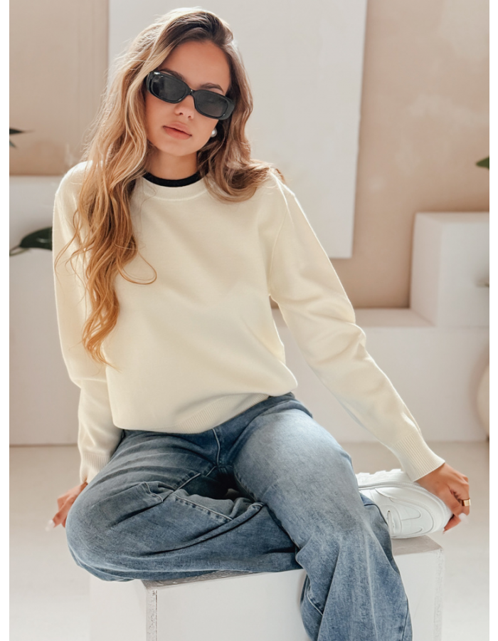 Sweter DARMILA to minimalistyczna propozycja na co dzień, która łączy wygodę z uniwersalnym stylem. Gładki materiał, prosty krój i kontrastowe wykończenie przy dekolcie tworzą bazę do wielu codziennych stylizacji.