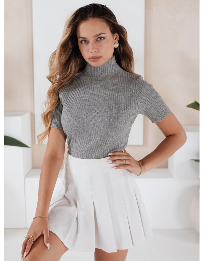 Ten dopasowany sweter z krótkim rękawem i prążkowaną strukturą to propozycja dla miłośniczek minimalizmu i elegancji. Dzięki półgolfowi doskonale sprawdza się zarówno solo, jak i jako baza pod marynarki czy kardigany.