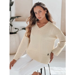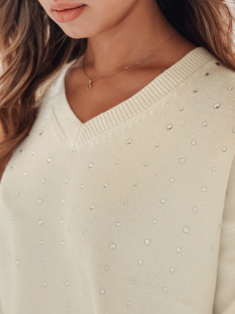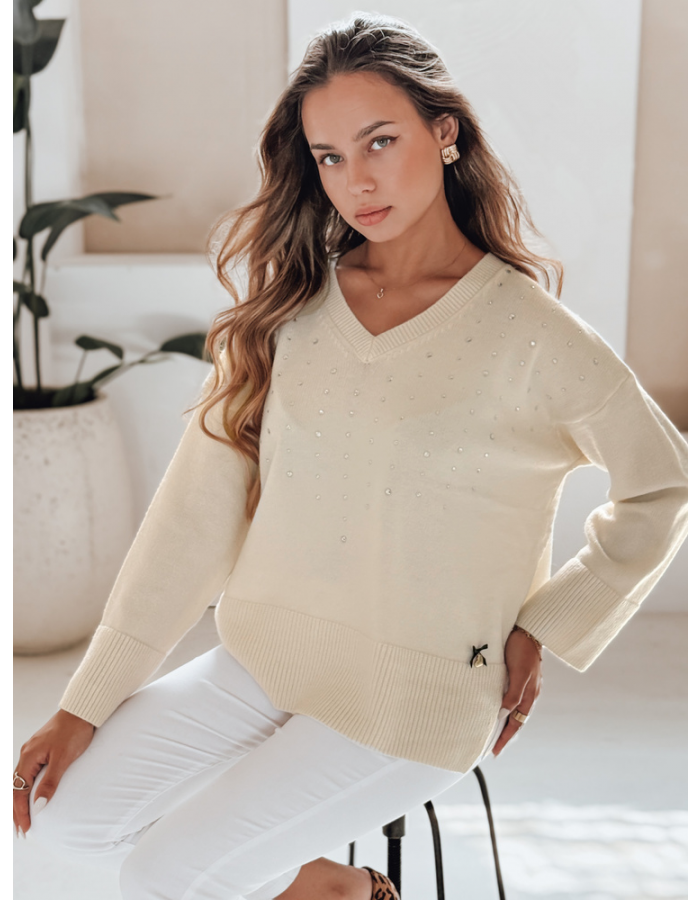 Elegancki sweter z delikatnymi zdobieniami to idealna propozycja na chłodniejsze dni. Luźniejszy krój zapewnia wygodę, a dekolt w serek pięknie podkreśla szyję. Subtelne połyskujące aplikacje dodają mu charakteru, a mała ozdoba z kokardką przy ściągaczu stanowi modny detal.