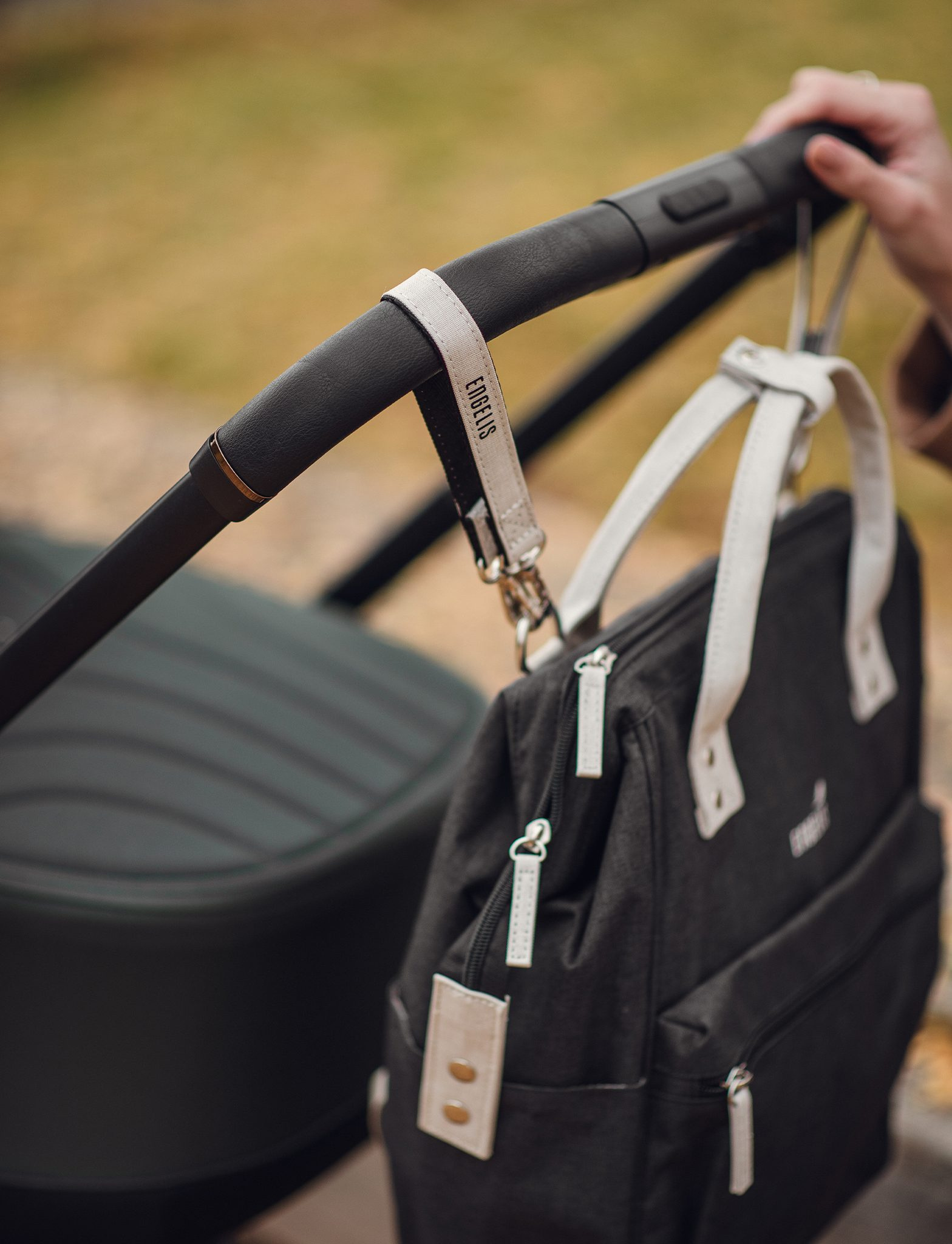 - Pevné popruhy se zesílenými karabinami k uchycení na kočárek