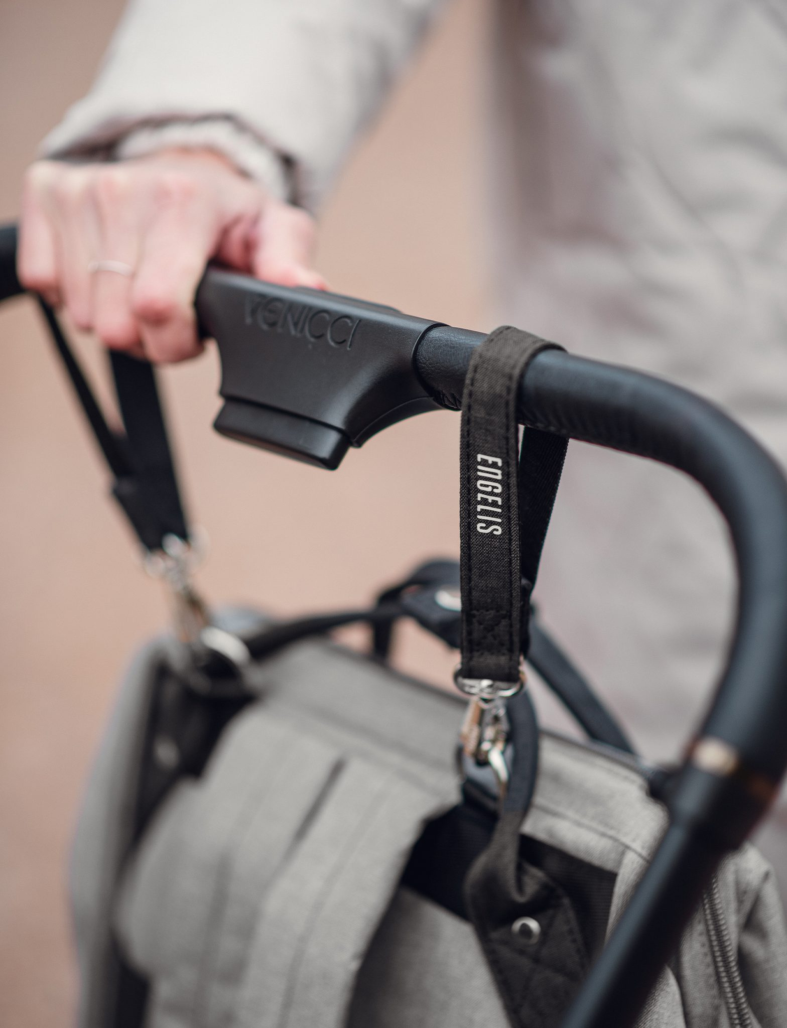 • Pevné popruhy se zesílenými karabinami k uchycení na kočárek