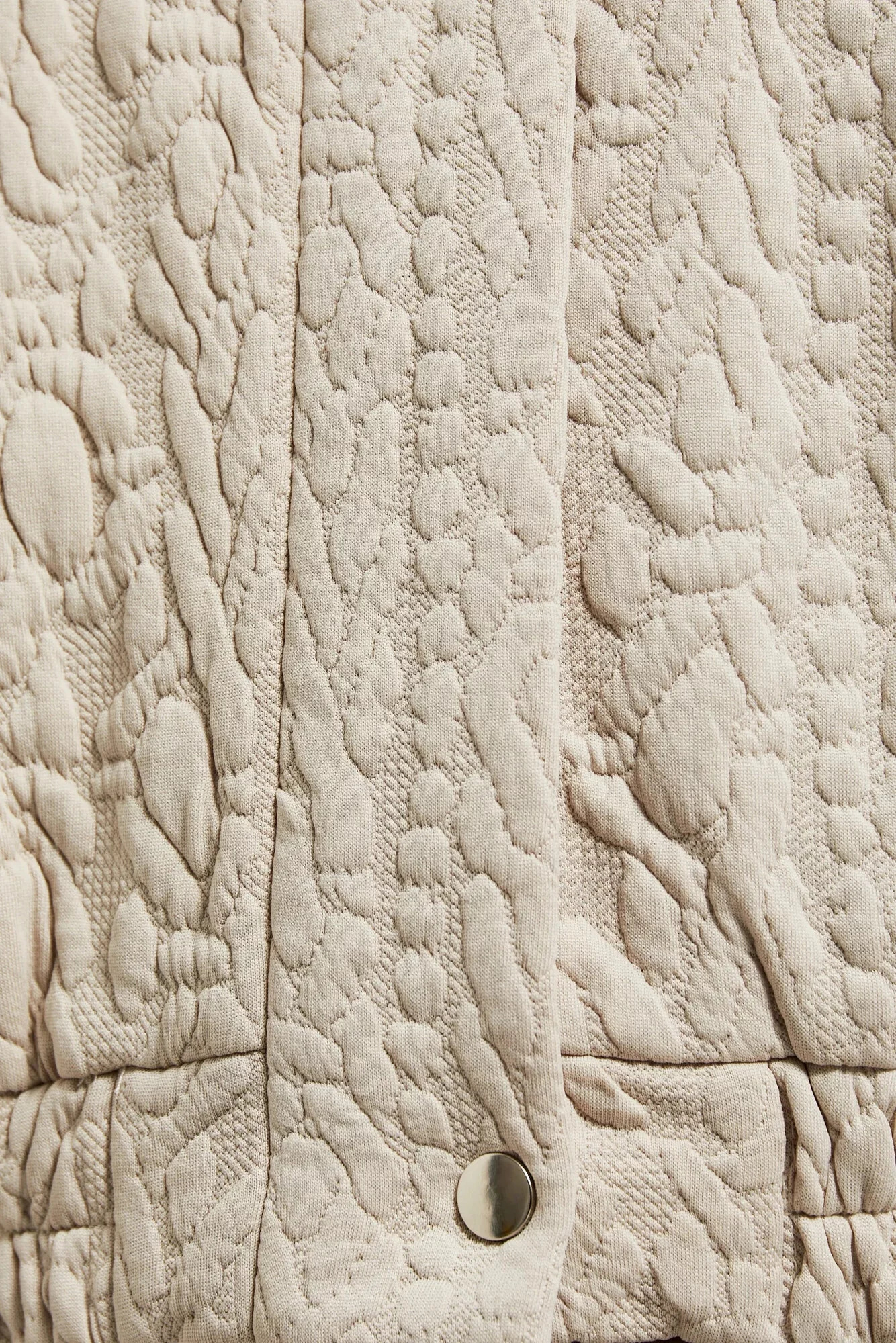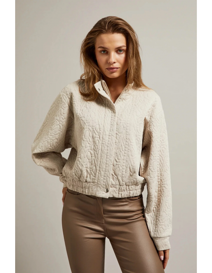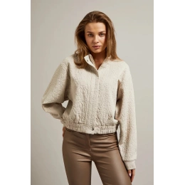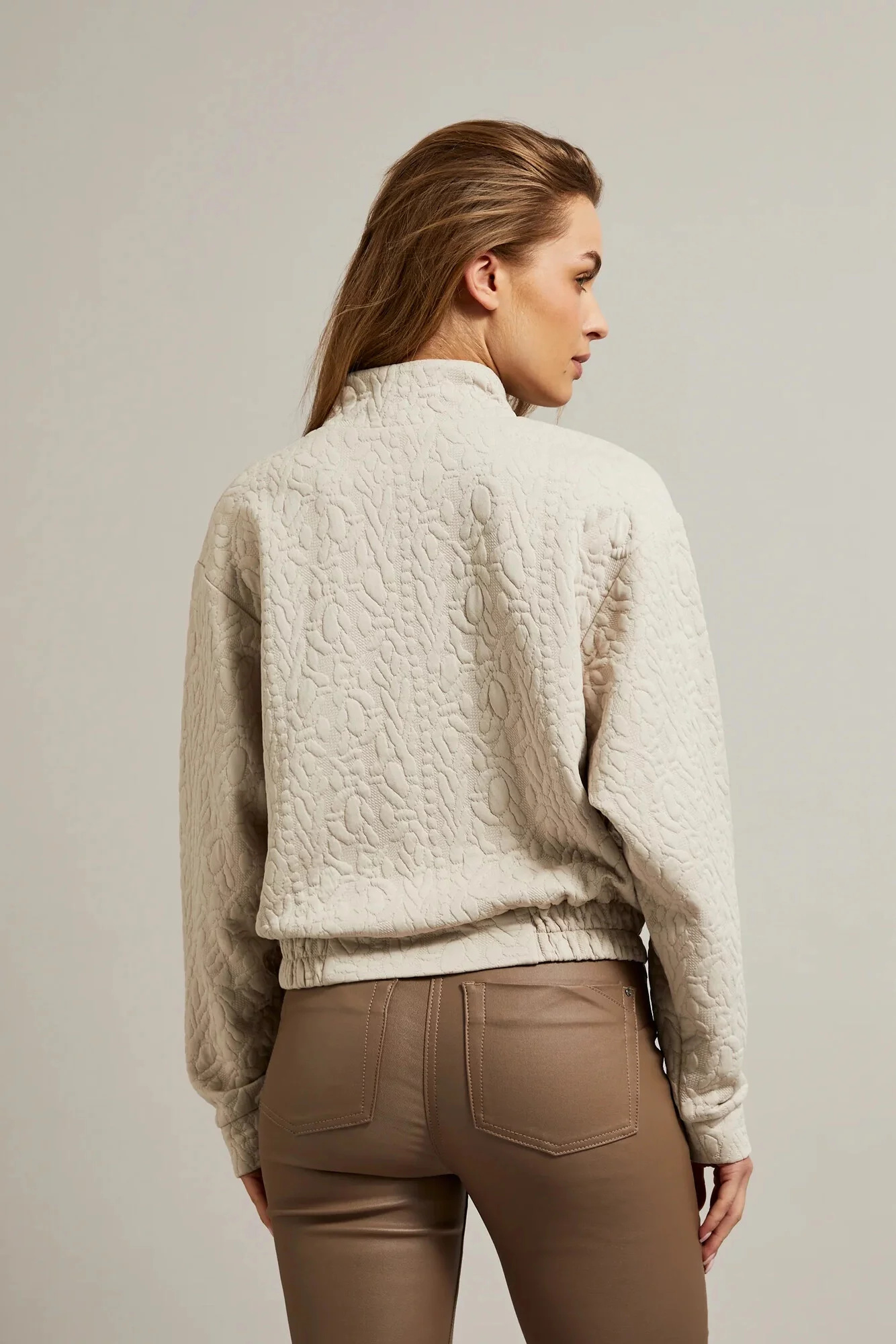 95% POLYESTER, 5% ELASTAN Krémová dámská mikina v barvě ecru s žakárovým vzorem je ideálním doplňkem do tvého šatníku. Vyrobena z vysoce kvalitního polyesteru, má praktické zapínání na zip a pohodlný pružný lem dole a na rukávech. Další výhodou je elegantní stojáček s kulatým zapínáním. Tato stylová mikina se skvěle hodí pro různé příležitosti, jak na každodenní nošení, tak i na speciální události. Dokonale padne pod sako, sukni nebo dokonce džíny, vytvářejíc jedinečné a módní kombinace. Díky své krémové barvě a elegantnímu vzoru můžete vytvořit jedinečné stylizace, které přitáhnou pozornost ostatních.