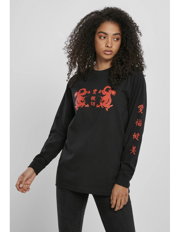 Draci jsou cool! Tento Longsleeve to dokazuje potiskem, který silně připomíná čínské nástěnné malby. Potisk v kombinaci s čínskými znaky na rukávu dělá z jednoduchého černého dlouhého rukávu jednoduše cool kousek.