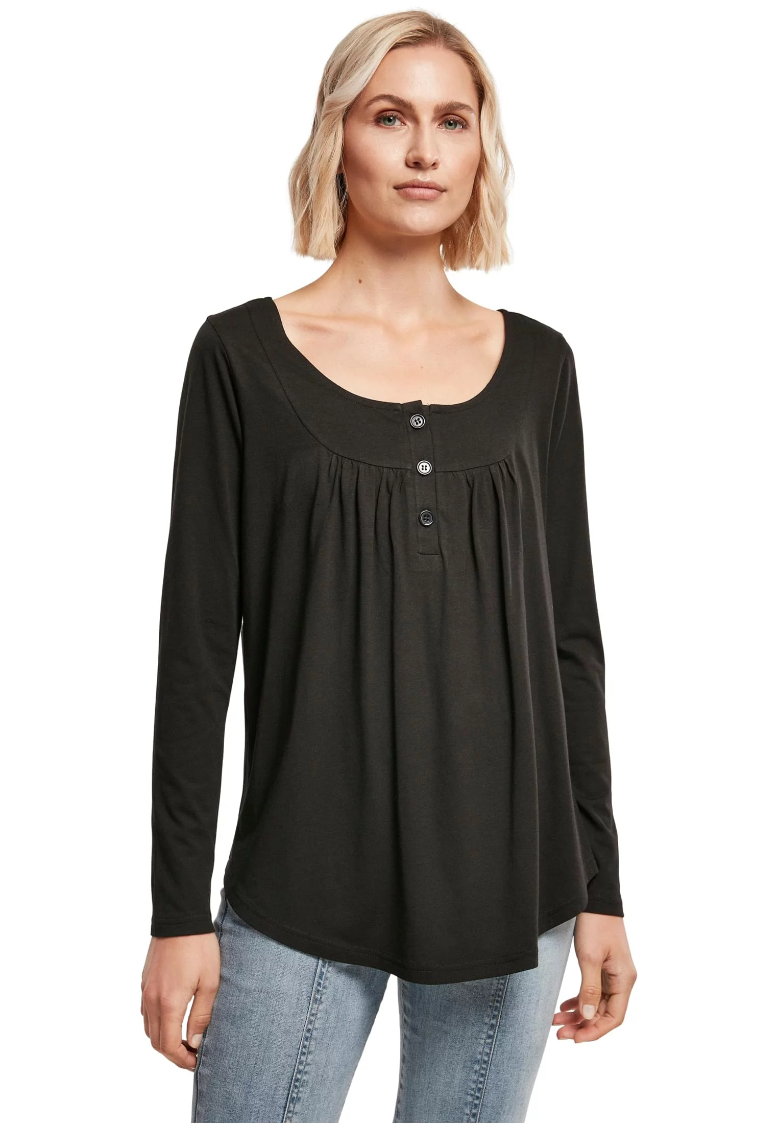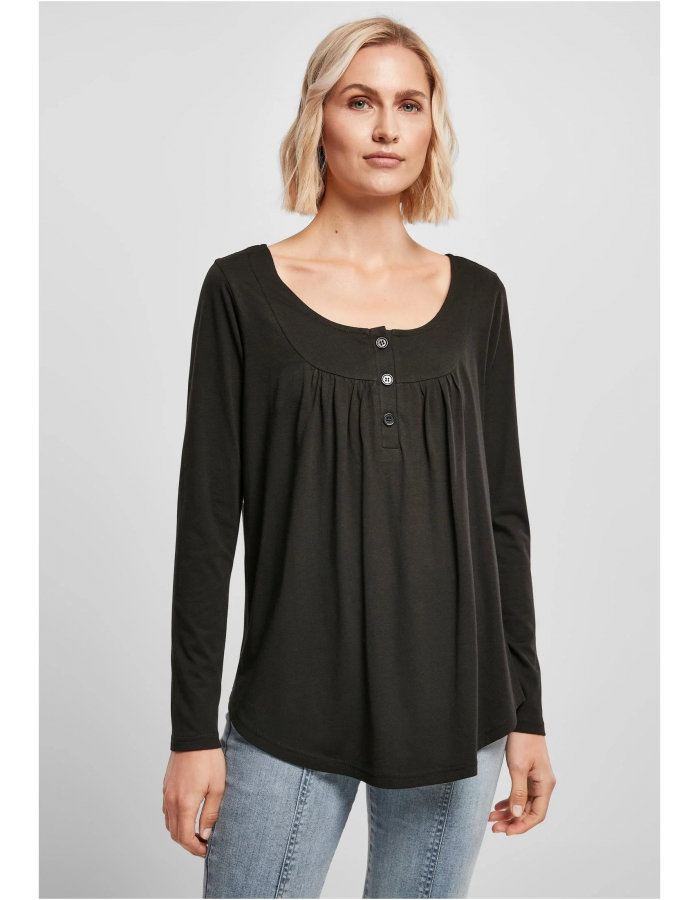 Dámská košile s dlouhým rukávem je vyrobena s propracovanými detaily a zajišťuje spoustu stylové rozmanitosti. Má široký kulatý výstřih, který končí krátkou knoflíkovou légou. Díky jemnému dělícímu švu se dámská košile nabírá nad hrudníkem. Nízký výstřih na zádech je zvýrazněn dodatečným křížovým švem. Košile padá široce a měkce přes tělo nositele, zatímco rukávy umožňují těsnější padnutí. Celoplošný ležérní a elegantní styl završuje zaoblený lem a zvýšený boční šev. Dámský top je vyroben z příjemného materiálového mixu bavlny a viskózy.