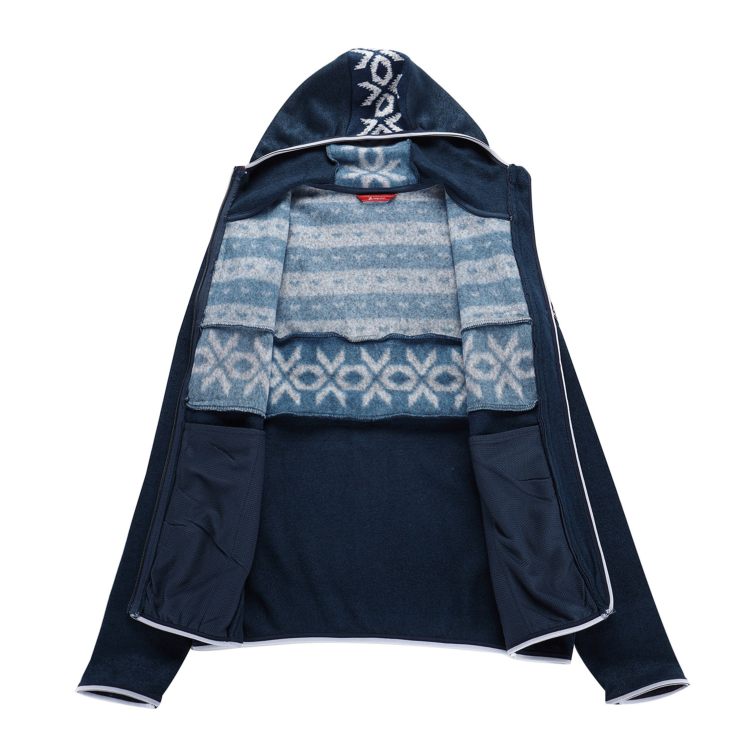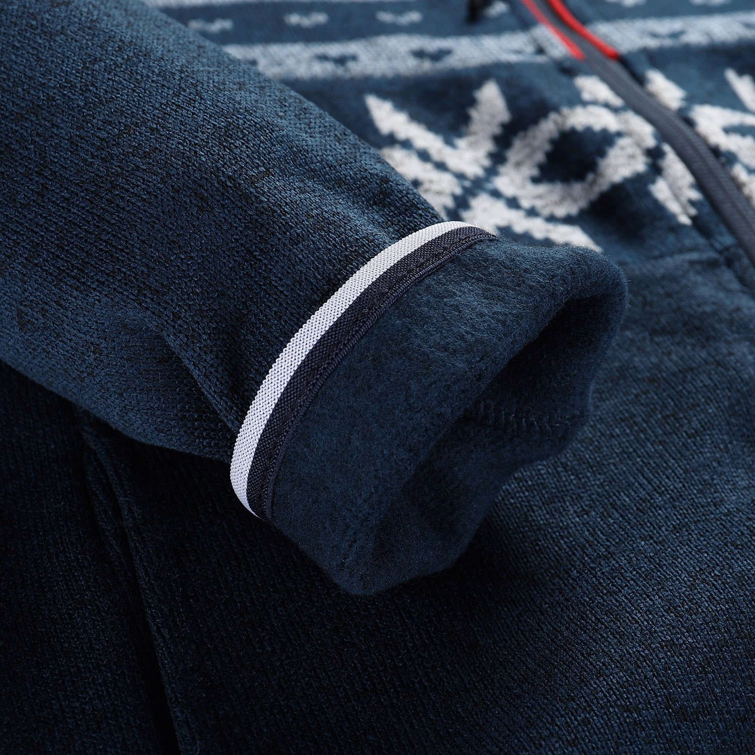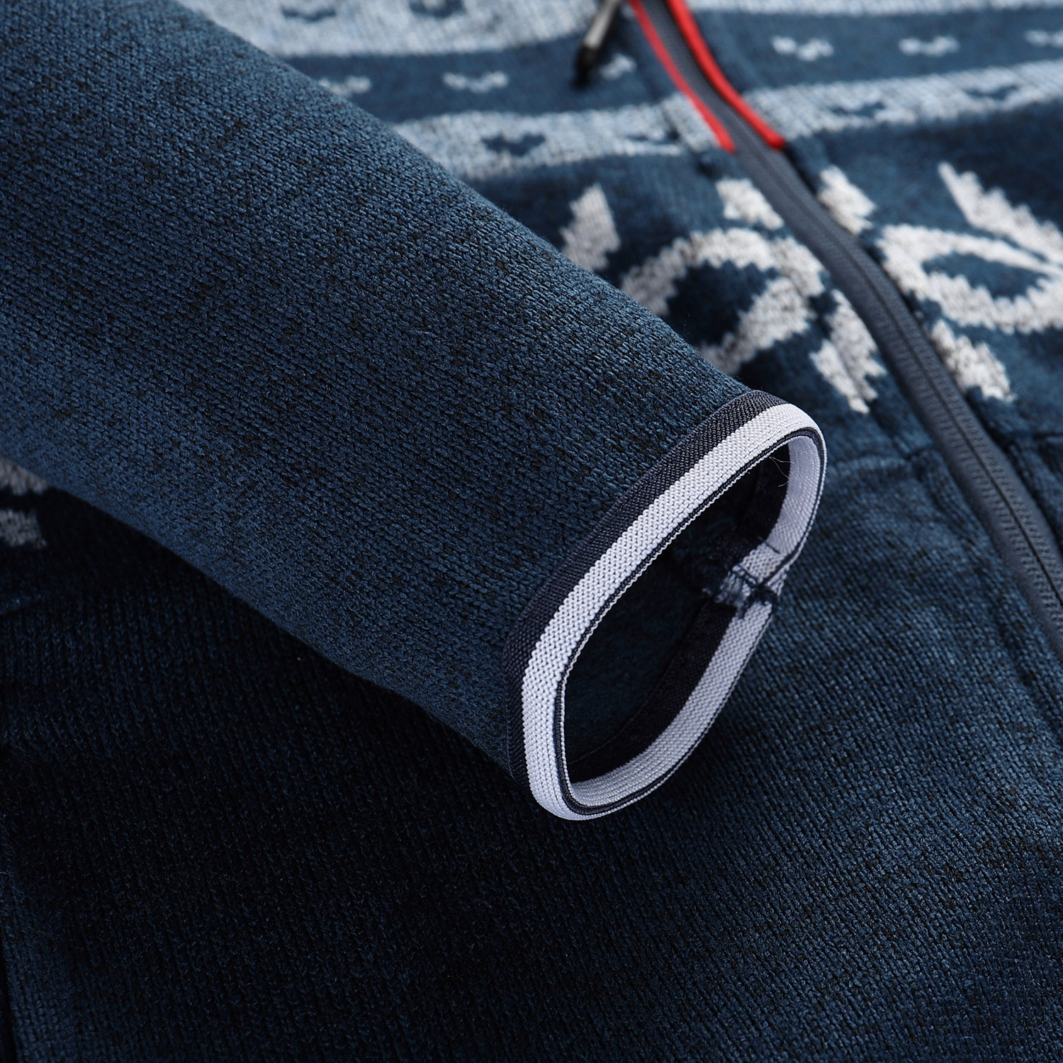 Polopřiléhavý střih zajišťuje pohodlné nošení, zatímco kapuce lemovaná gumou a krytka u brady poskytují ochranu proti větru a chladu. Rukávy a spodní část svetru jsou zakončeny gumovým lemem pro lepší přizpůsobení a komfort. Svetr má dvě praktické kapsy a nášivku na rukávu, taháčky u zipů jsou delší pro snadnou manipulaci.