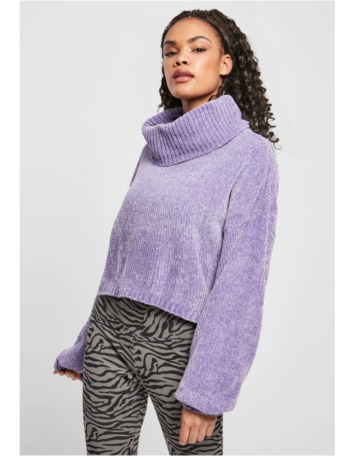 Tento pružný dámský svetr z lesklého žinylkového úpletu je vydařeným módním společníkem a vyznačuje se XXL žebrovaným rolákem a krátkým oversized střihem. Moderní styl svetru završují balonové manžety. Dále je svetr opatřen úzkými žebrovanými manžetami na rukávech a lemu.