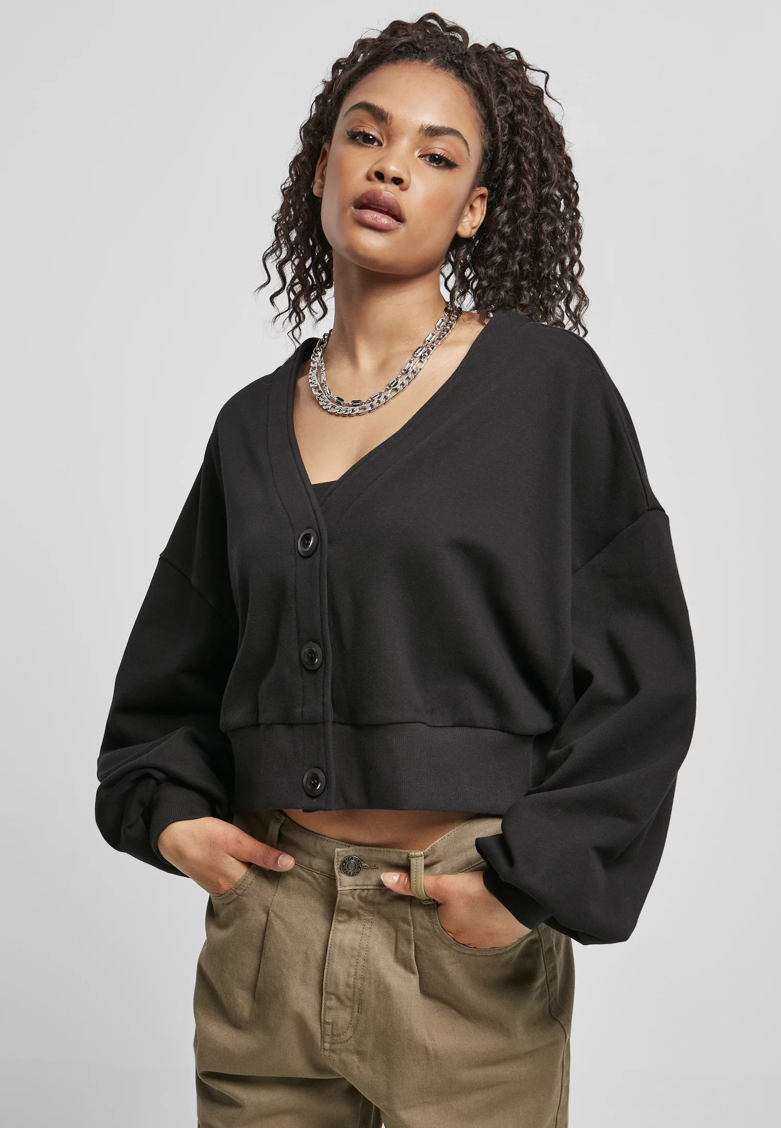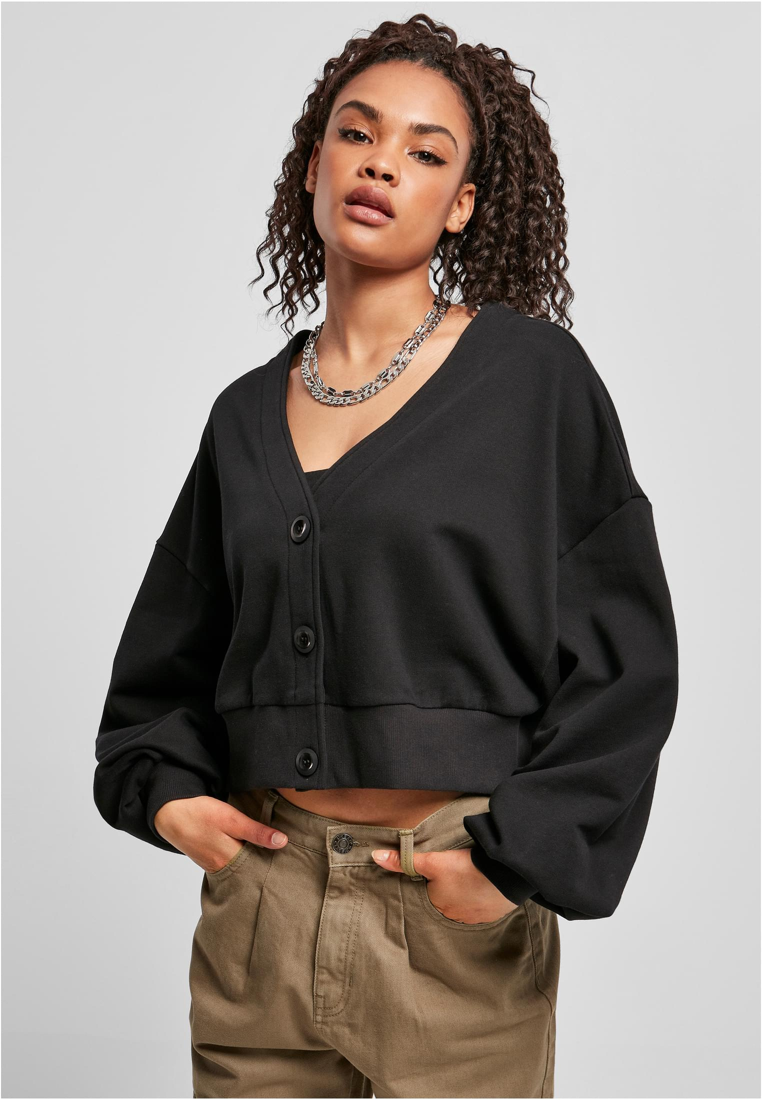 Krátký dámský kardigan nabízí oversized střih a extra široké rukávy. V kontrastu stojí krátká délka, která přináší požadovaný trendy vzhled. Výstřih do V je pěkný a hluboký. Pod tím tři tónová tlačítka pěkně dotvářejí cardigan. Látka je z nejjemnější organické bavlny s odpovídající visačkou.