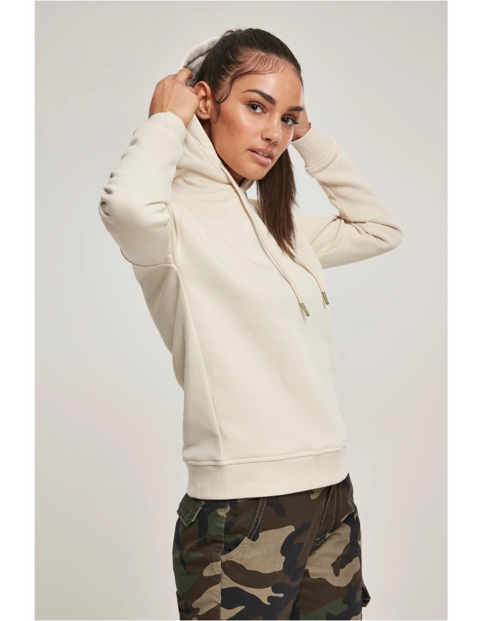Tato útulná dámská mikina s kapucí patří do každého módního šatníku. Kombinuje optimální pohodlí při nošení s časem prověřenými vlastnostmi mikiny. Samozřejmostí je kapuce s odpovídajícími stahovacími šňůrkami – špičky jsou kovové. Široké manžety na rukávech, spodním lemu a ramenou nejlépe padnou. Skutečným vrcholem dámské mikiny s kapucí je materiál z organické bavlny šetrný k pokožce s extra měkkým česaným fleecem na vnitřní straně.