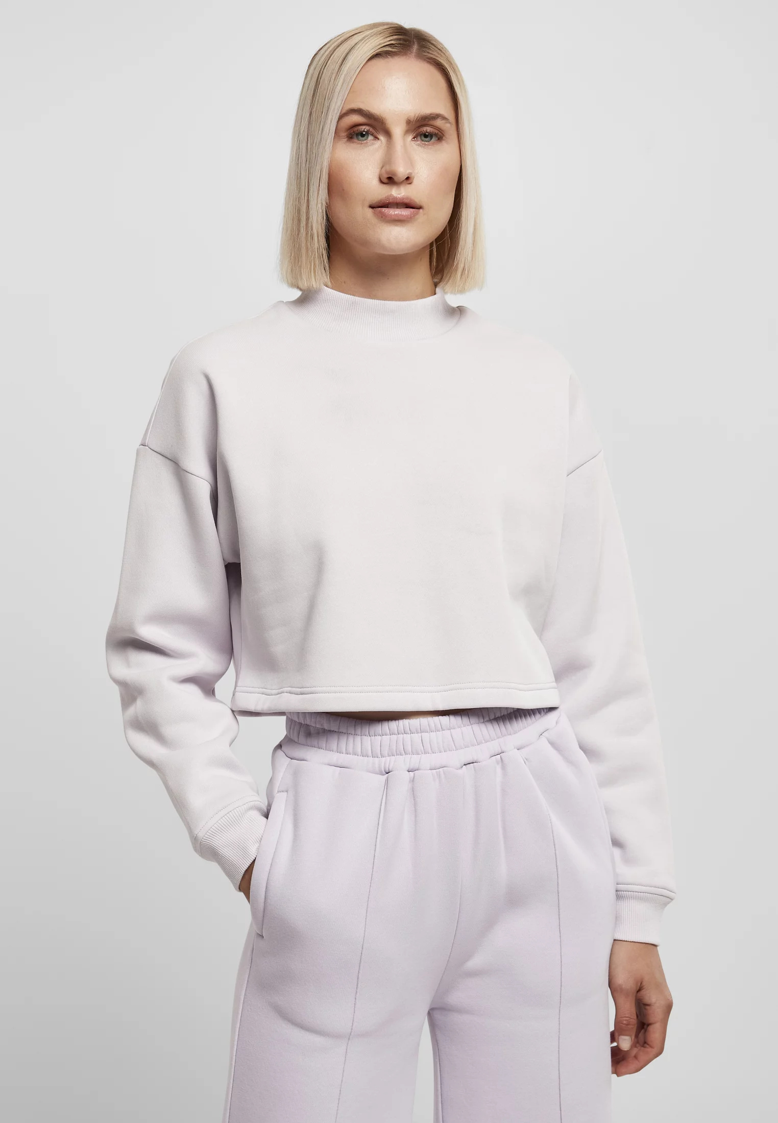 Tato dámská mikina vyrobená z hladkého česaného fleecu je stejně pohodlná jako sexy. Dlouhé rukávy se širokými žebrovanými manžetami a malým žebrovaným límcem hravě vyznívá zkrácený střih. Volný střih mikiny se širokými spadlými rameny se dokonale hodí k ležérnímu vzhledu.