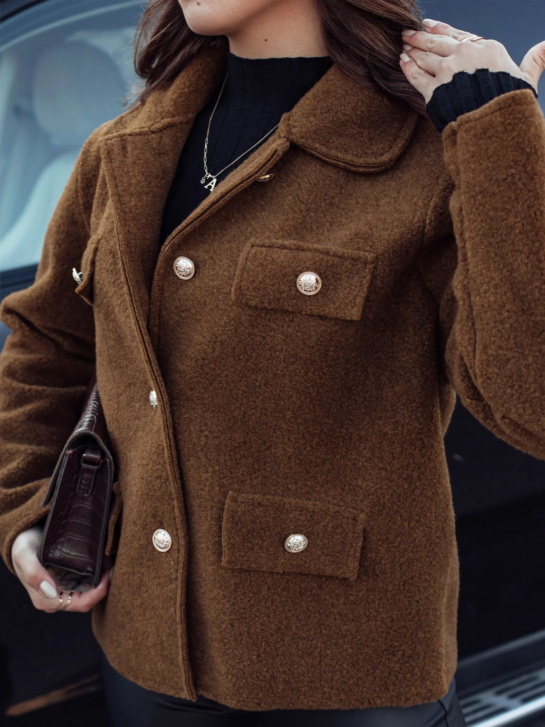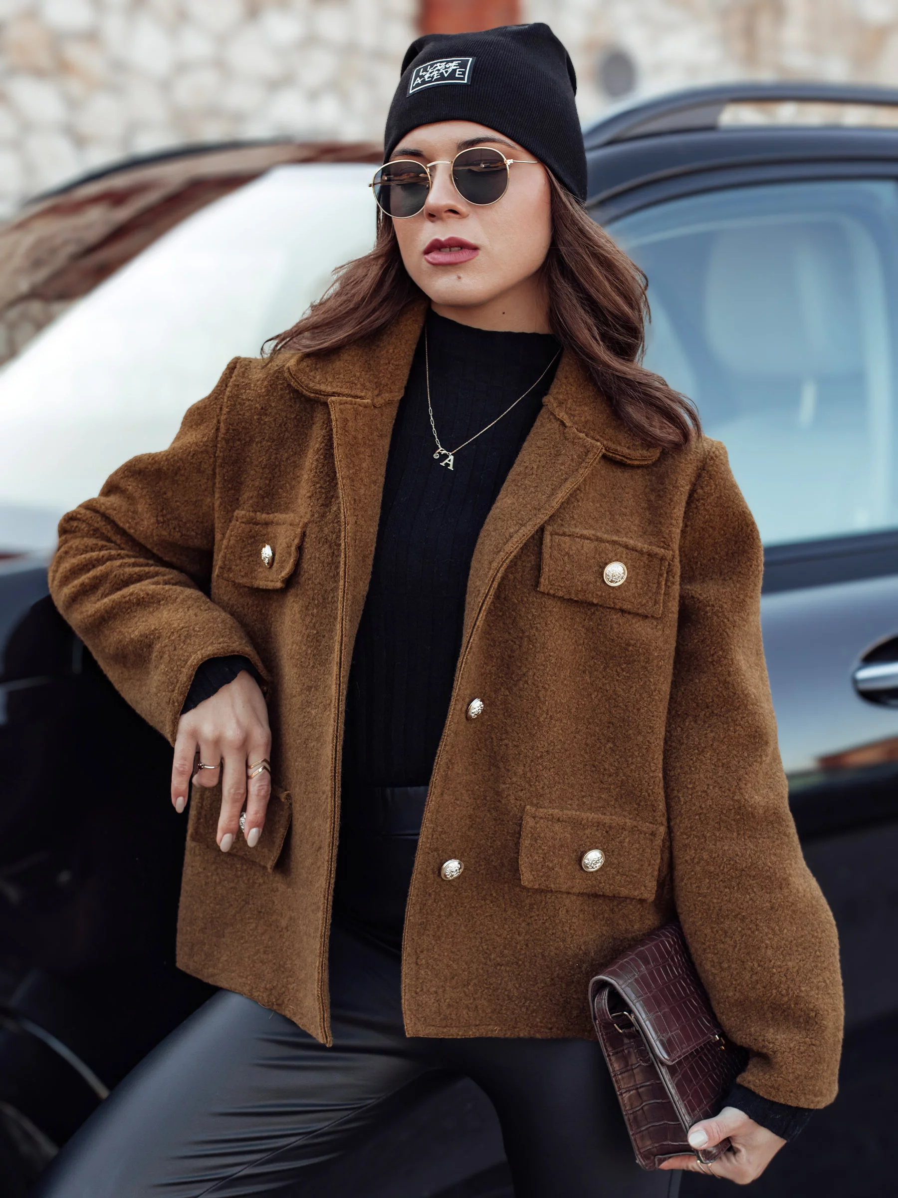 Kabát s moderním střihem, který se dokonale hodí k aktuálním trendům. Zlaté knoflíky mu dodávají eleganci a odolný, měkký materiál zaručuje pohodlí při nošení. Dokonalá nabídka pro ty, kteří si cení módního vzhledu spojeného s funkčností. Ideální na podzimní a zimní sezónu, jak pro každodenní nošení, tak i pro formálnější stylizace.
