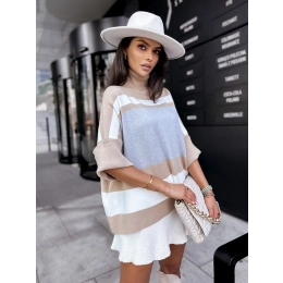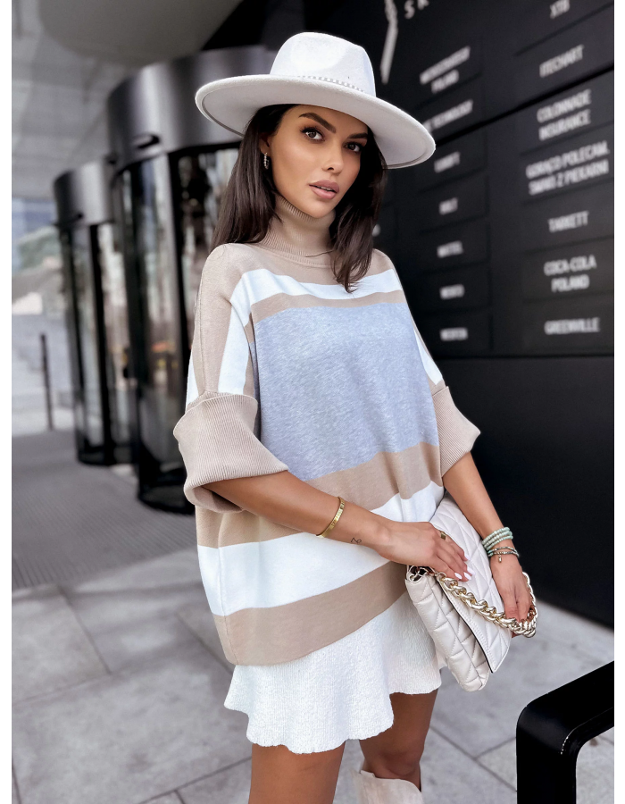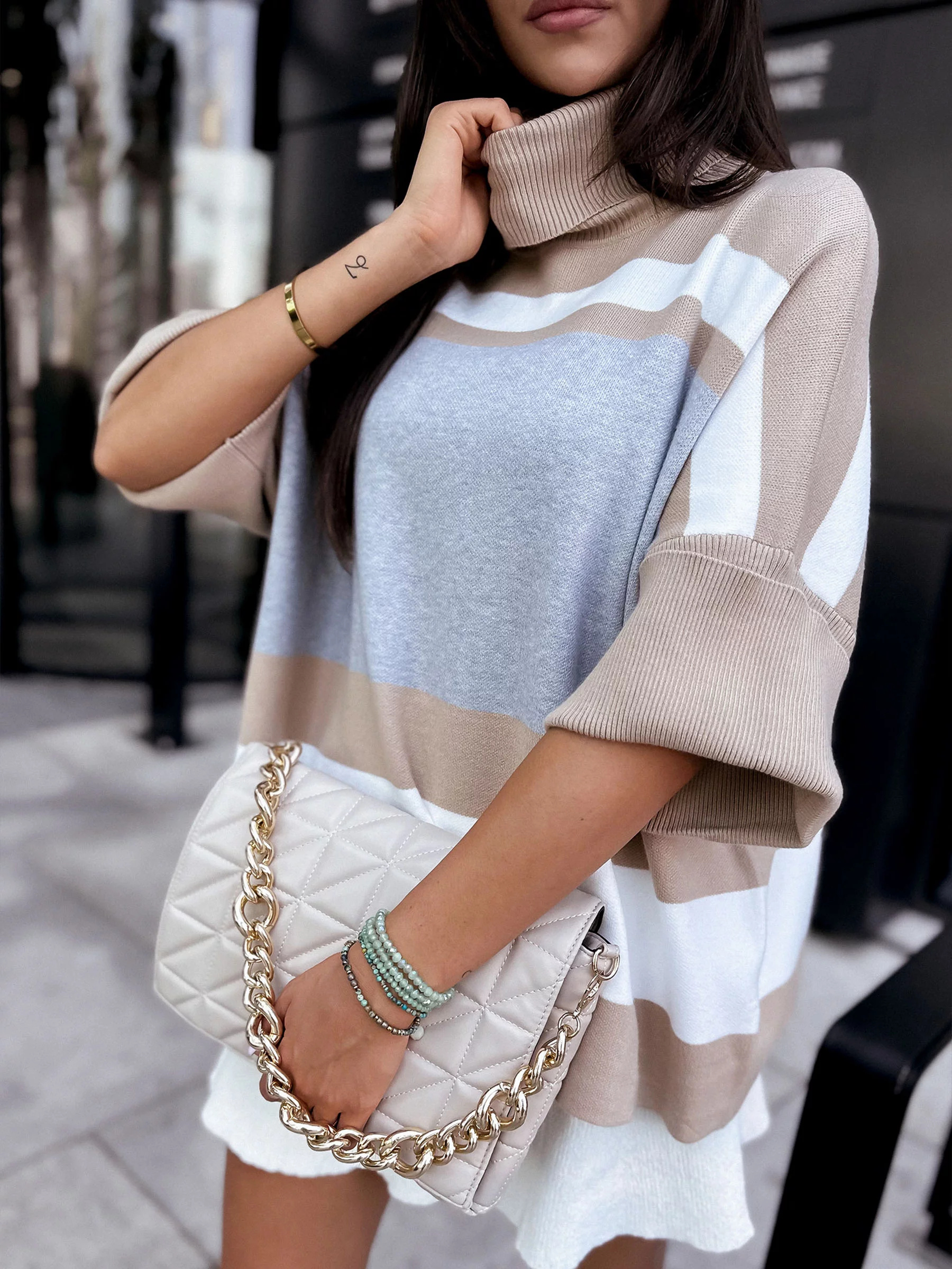 Svetřík oversize střihu s rolákem a ohrnutými rukávy o délce 3/4 je návrh. s kterou vytvoříš bezchybné podzimní a zimní stylizace. Vyrobený z vysoce kvalitního materiálu, mimořádně příjemný na dotek. Díky vhodné barevné kombinaci se bude prezentovat módně a stylově. Dostupný v pěti barevných variantách.