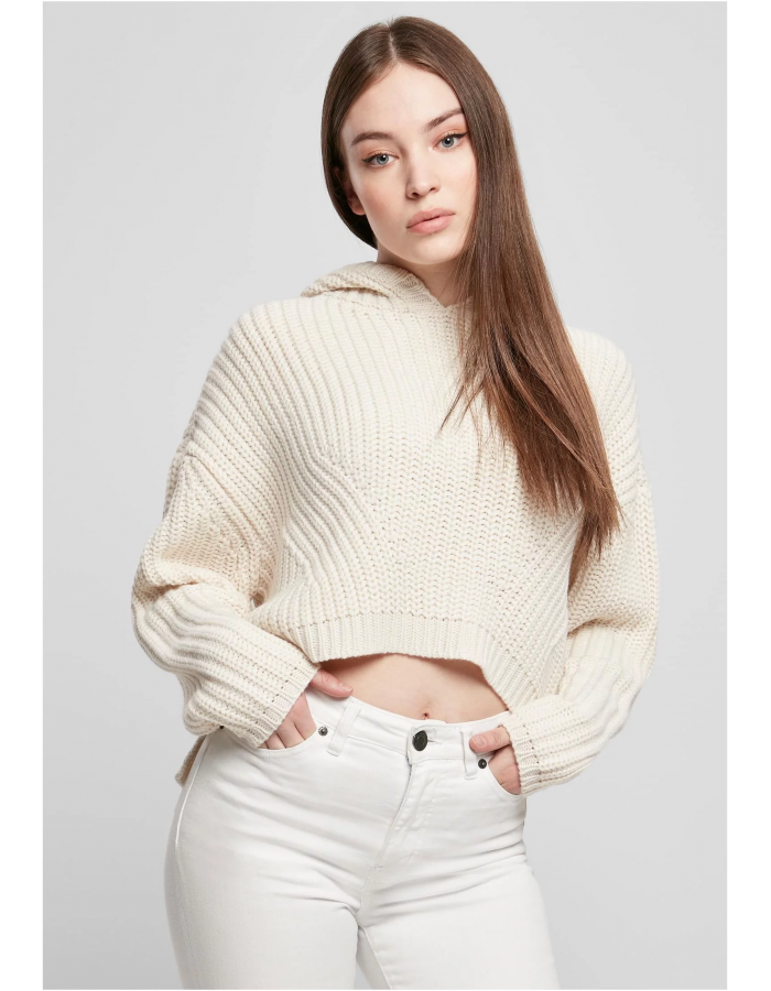Jako autentická módní kreace je tento dámský top dokonalou směsí moderního pleteného svetru a příjemné mikiny s kapucí. Je střižena jako široký oversize střih se spadlými rameny a má také oříznutý obrys, aby zdůraznil postavu. Diagonální široký žebrový úplet, který se v jeho středu sbíhá, zajišťuje dynamický vzhled a je doplněn přídavnou kapucí. Nevšední svetr je vyroben z poddajného polyakrylu.