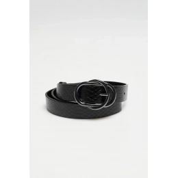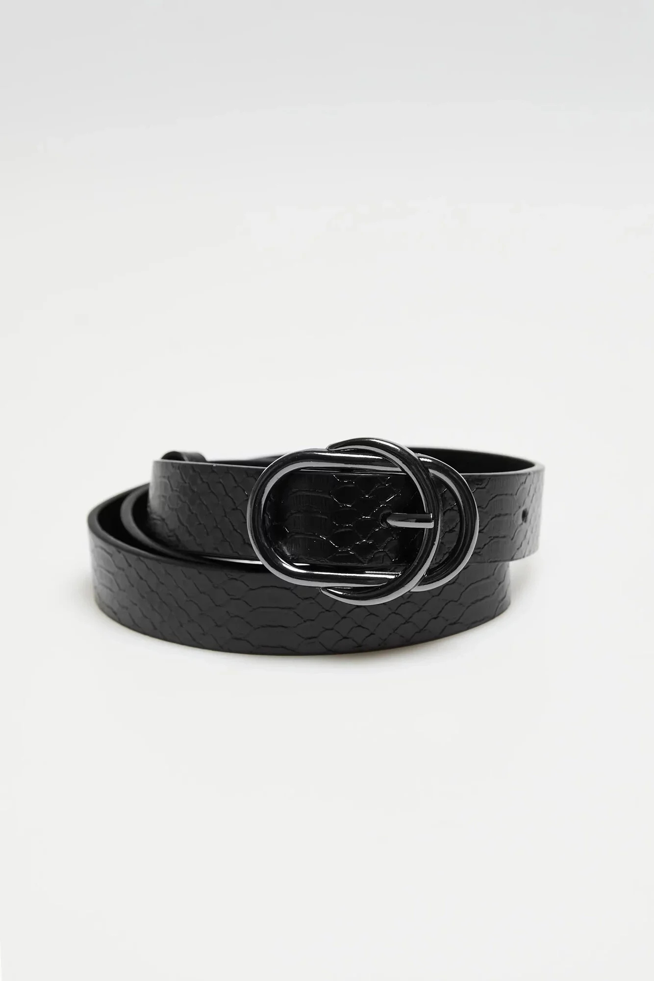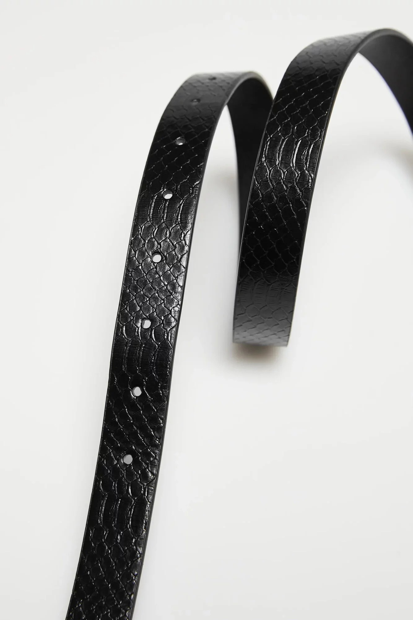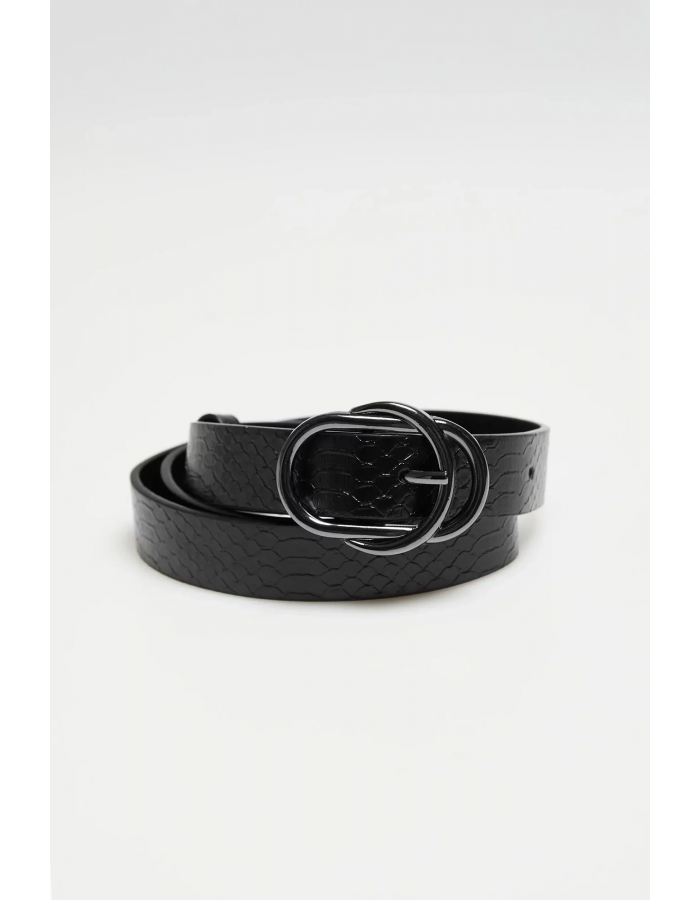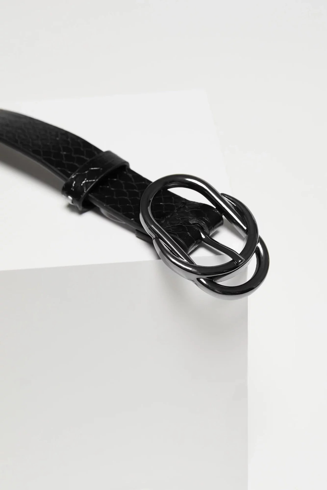 100%POLYURETAN Elegantní dámský pásek v černé barvě, bez vzoru, vyrobený z hladkého polyuretanu. Ozdobná spona a efekt napodobující hadí kůži mu dodávají výjimečný charakter. Ideální doplněk k večerní stylizaci nebo formálnímu oblečení.