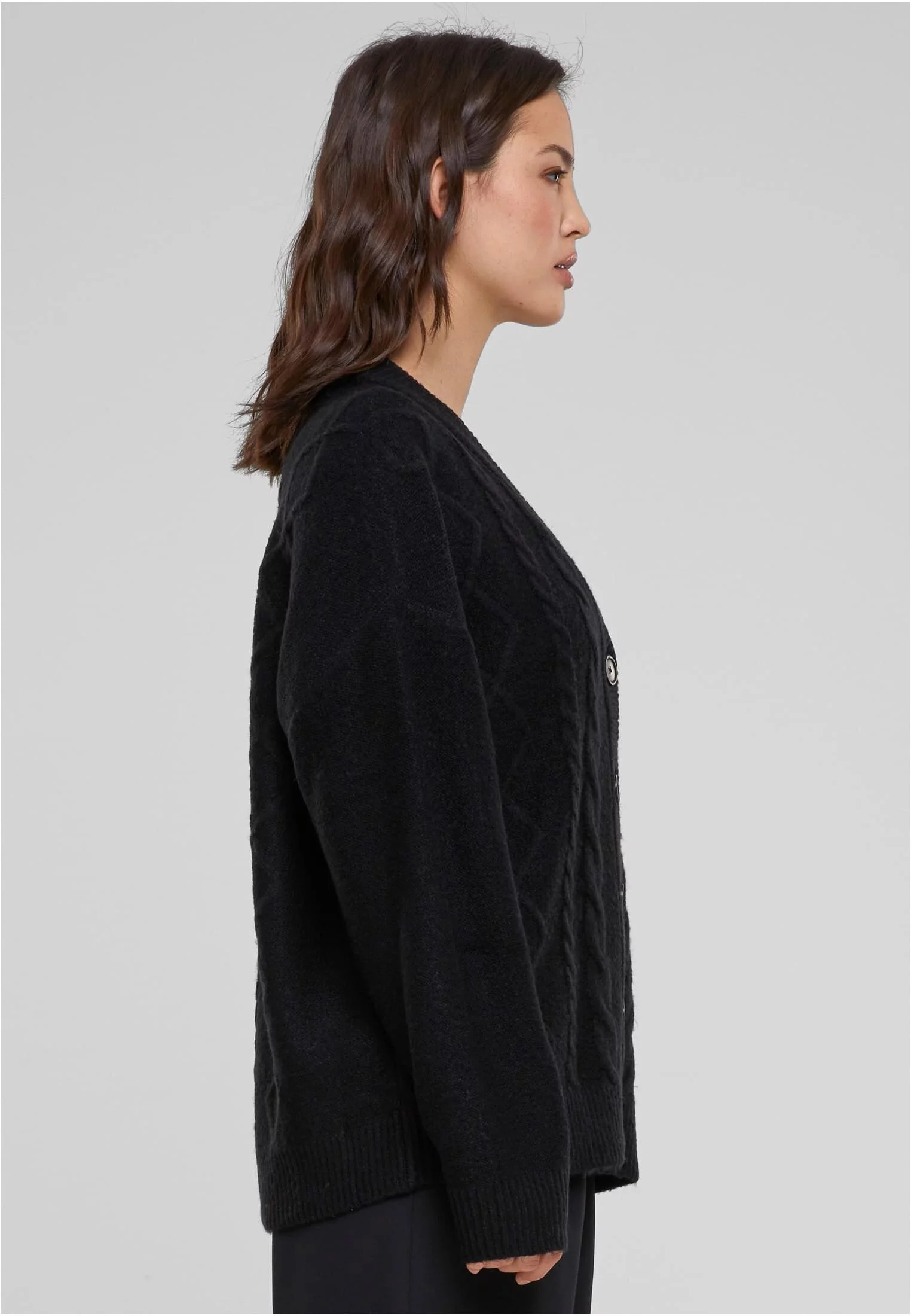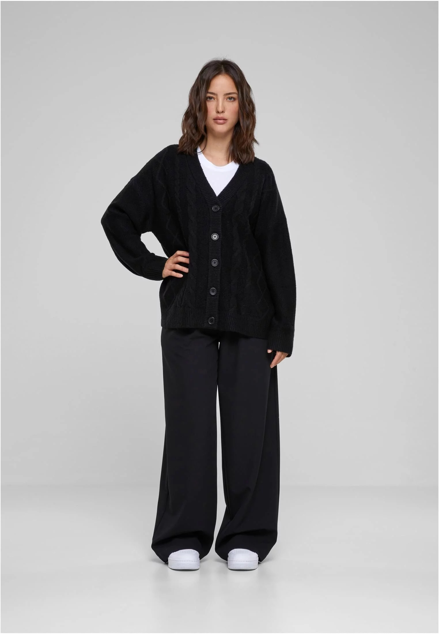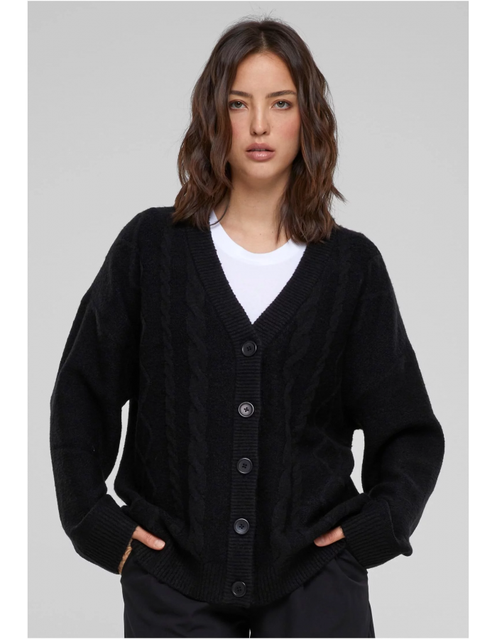 Dámský pletený kardigan reinterpretuje klasický tvar. Je to příjemný oversize střih se spadlými rameny a má hluboký výstřih do V a knoflíkovou légu. Vizuálním zvýrazněním je plastový vzor kabelu, který vede přes přední a zadní stranu. Hladká, ale odolná tkanina z akrylu a polyesteru umožňuje pohodlné nošení.