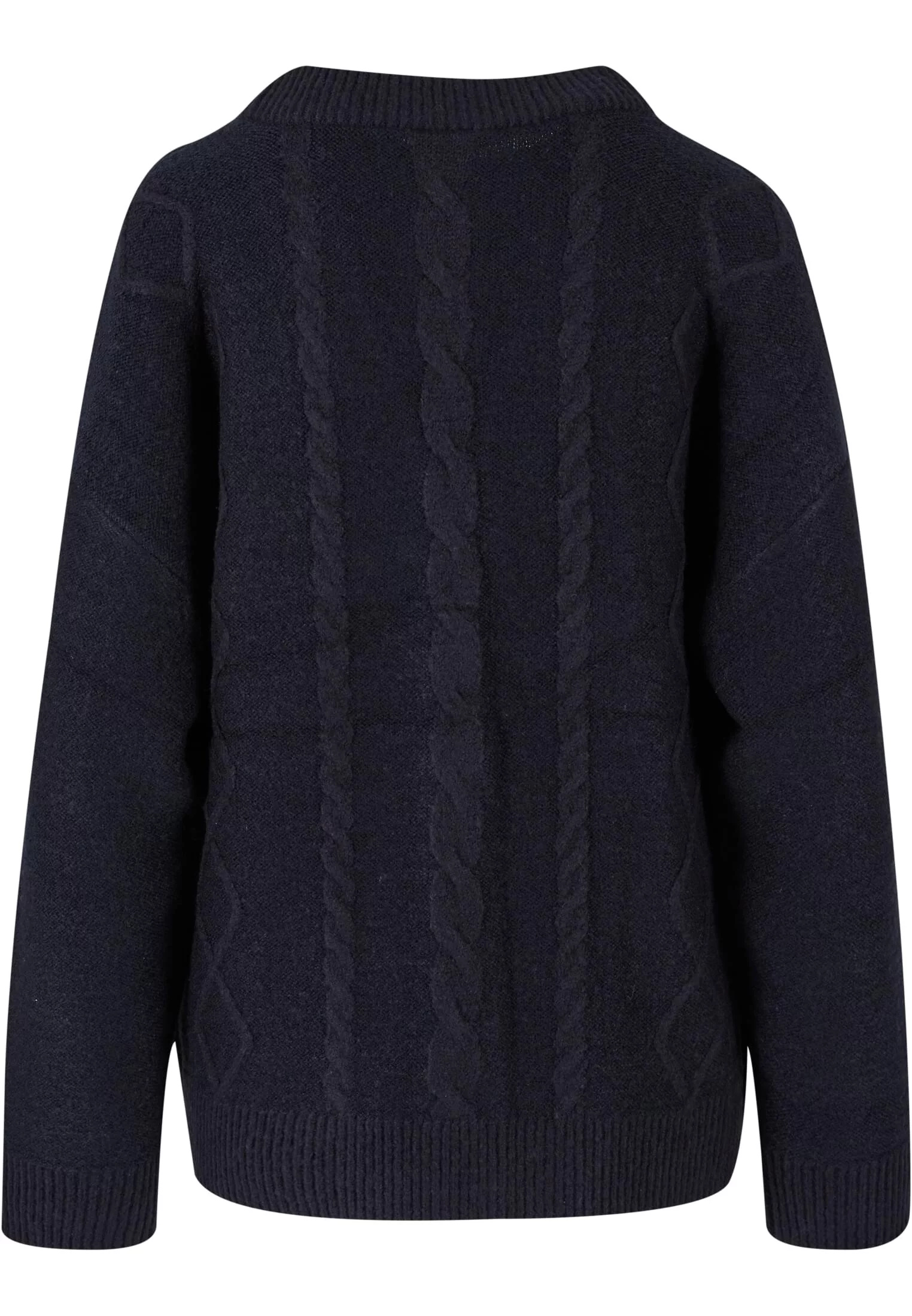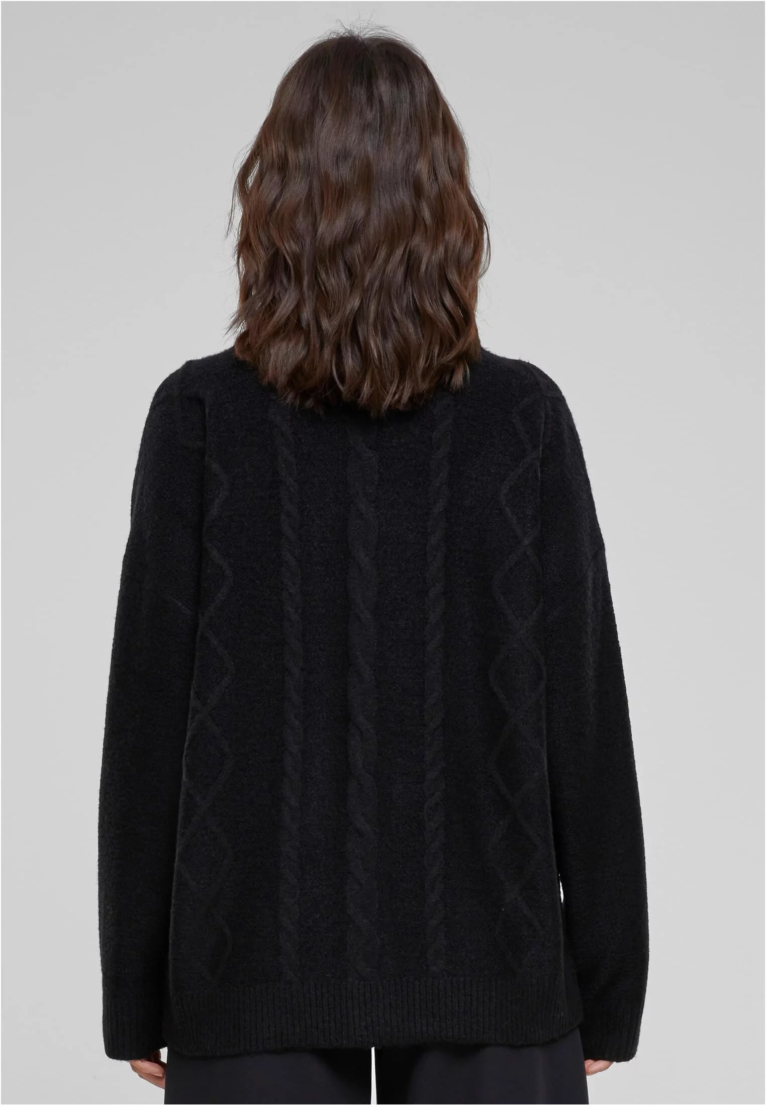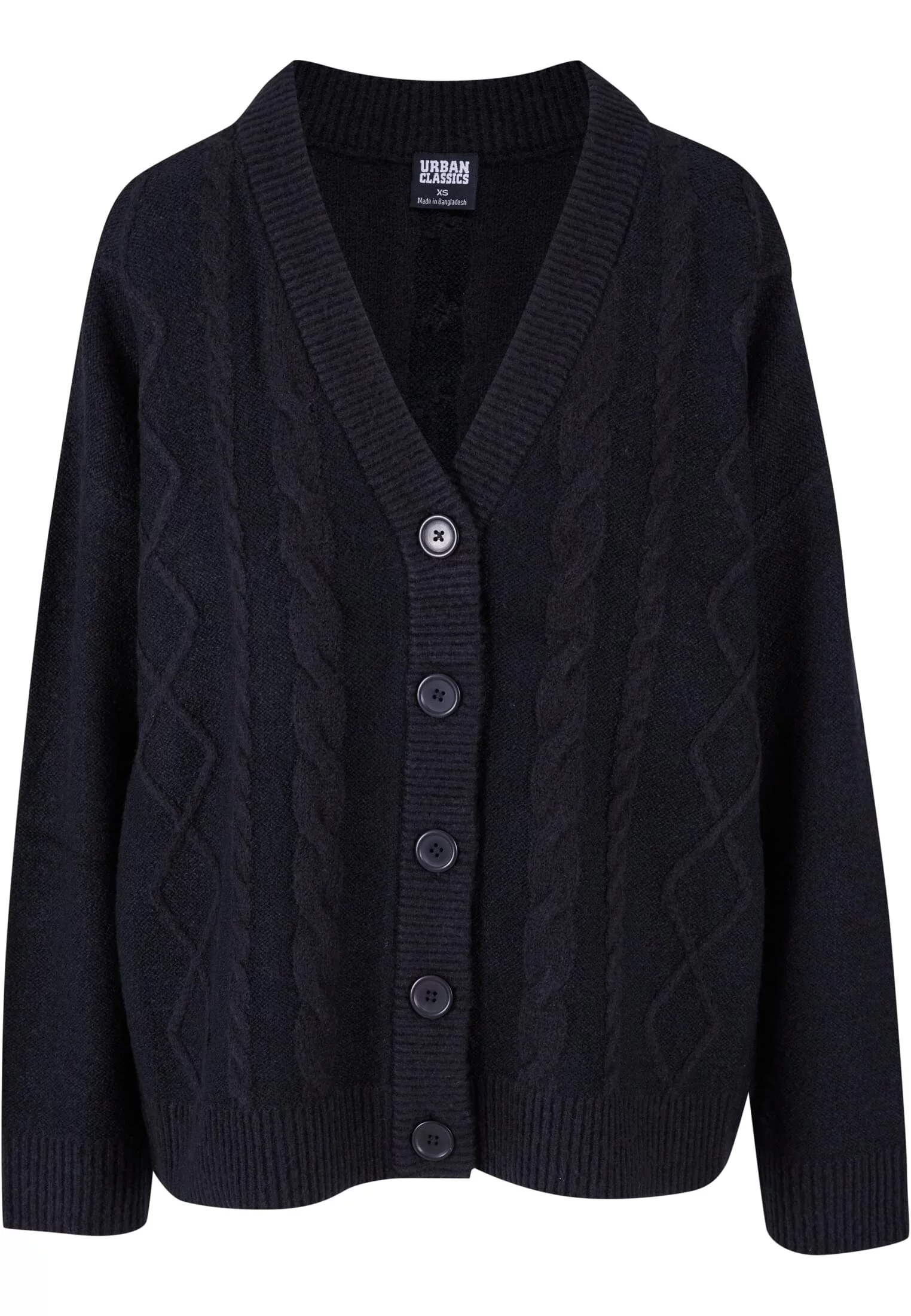 Dámský pletený kardigan reinterpretuje klasický tvar. Je to příjemný oversize střih se spadlými rameny a má hluboký výstřih do V a knoflíkovou légu. Vizuálním zvýrazněním je plastový vzor kabelu, který vede přes přední a zadní stranu. Hladká, ale odolná tkanina z akrylu a polyesteru umožňuje pohodlné nošení.