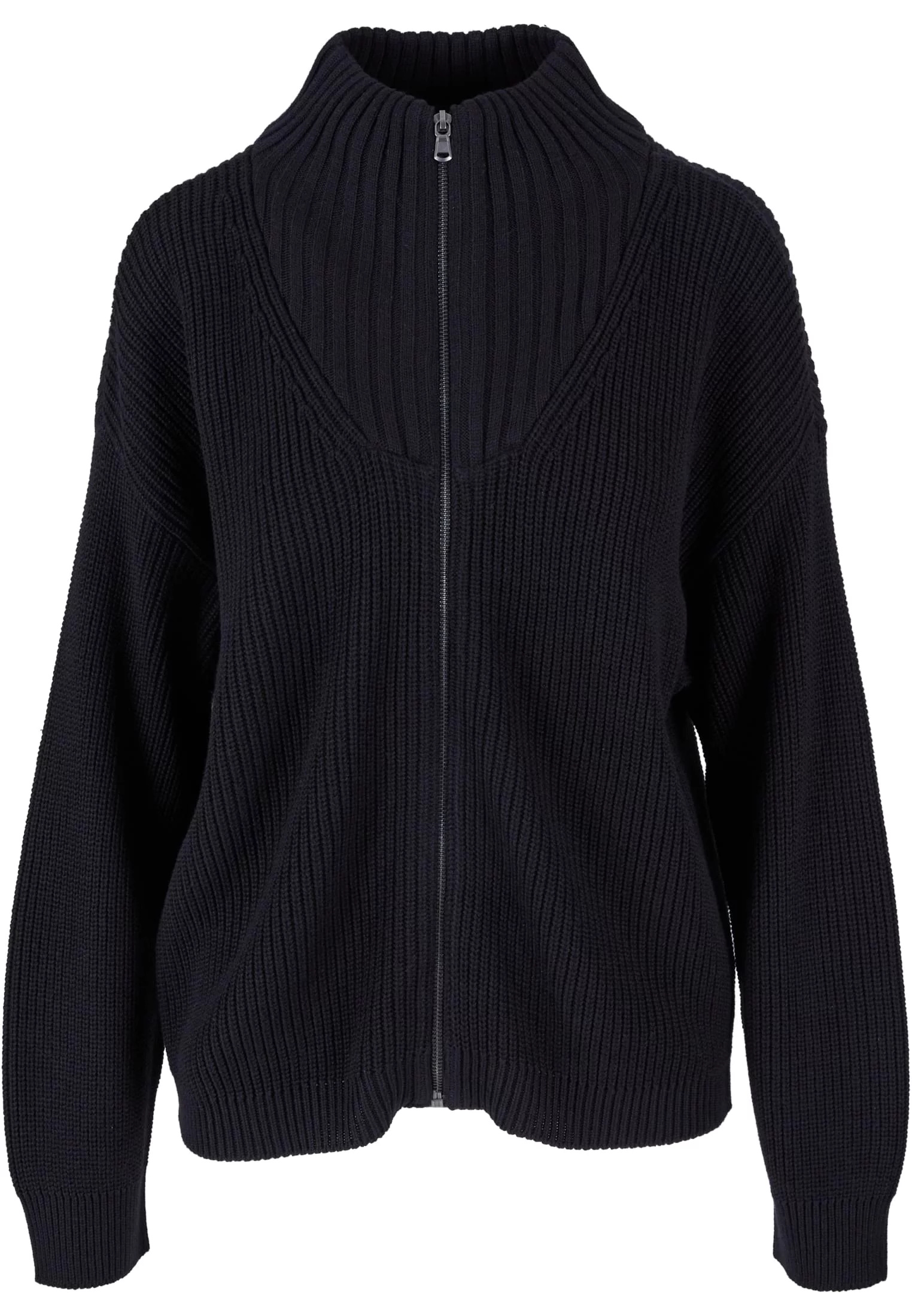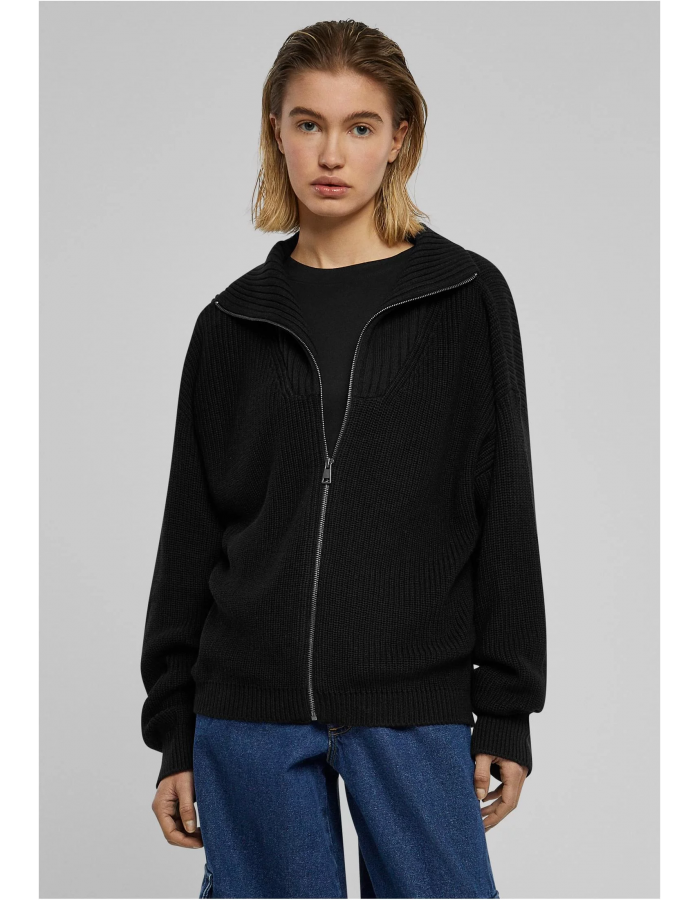 Tento moderní dámský kardigan má krásný stahovací límec a vyzařuje sebevědomí. Ležérní vzhled podtrhuje oversize střih se spadlými rameny. Detaily najdete v podobě změn vzoru žebrového úpletu na límci a klopě a také v jemných manžetách na rukávech a lemu. Dámský kardigan se skládá ze směsi bavlna-akryl a zapíná se na zip.