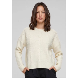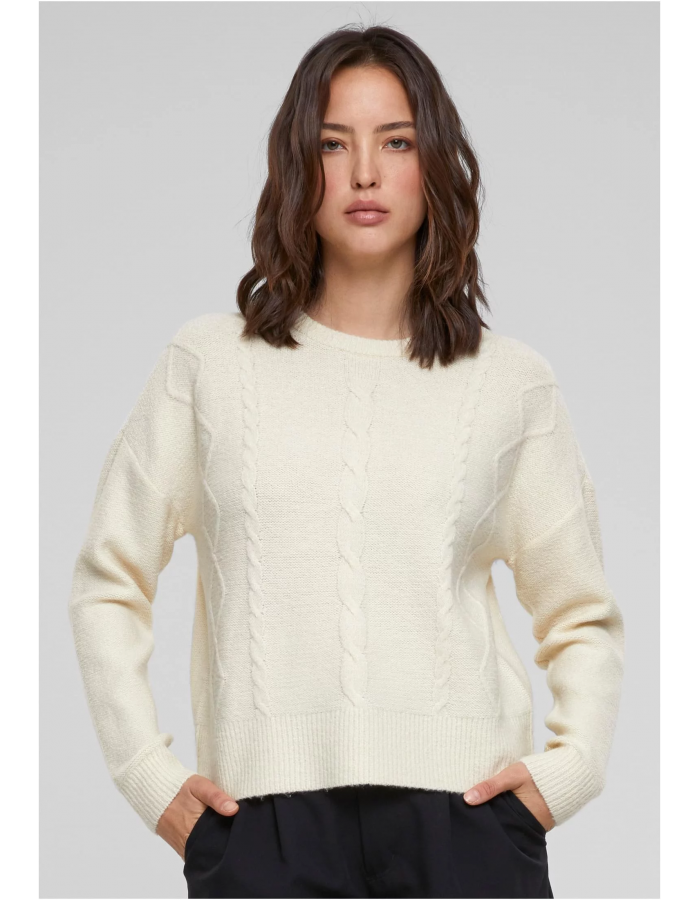 Trojrozměrný kabelový vzor na přední a zadní straně dámského pleteného svetru přitahuje pozornost. Oversize střih s širokými spadajícími rameny nabízí sebevědomou nonšalanci. Vroubkovaný výstřih a široké žebrované manžety na rukávech a spodním lemu dovedně doplňují vzhled. Dámský pletený svetr je vyroben z hladké směsi akryl-polyester.