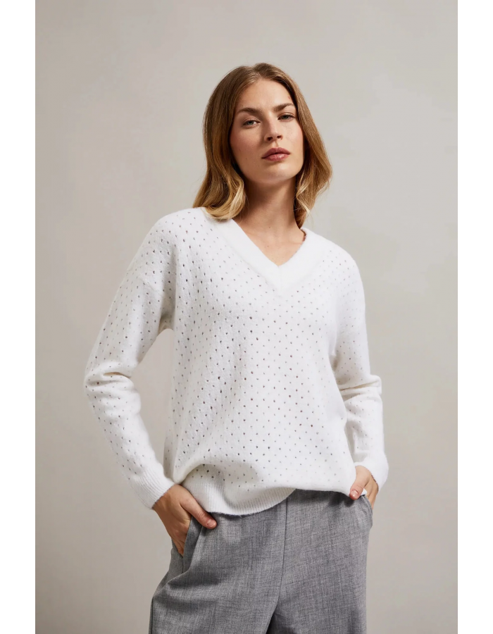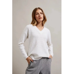 Dámský prolamovaný svetr s metalickou nití MOODO - bílý Velikost: XS
