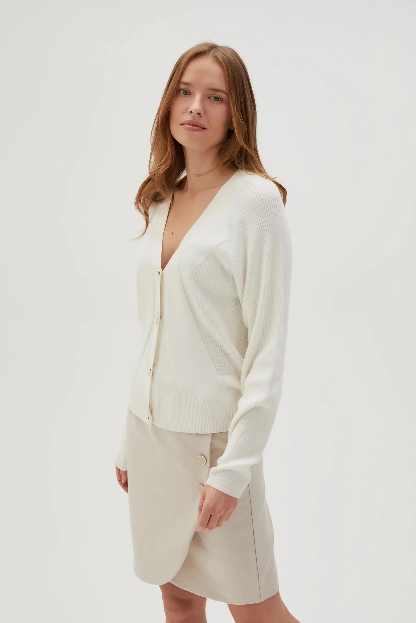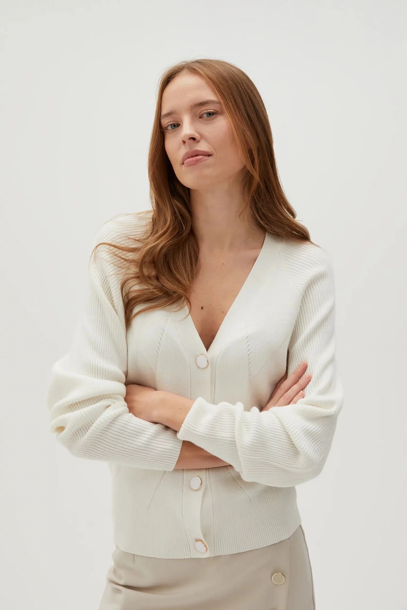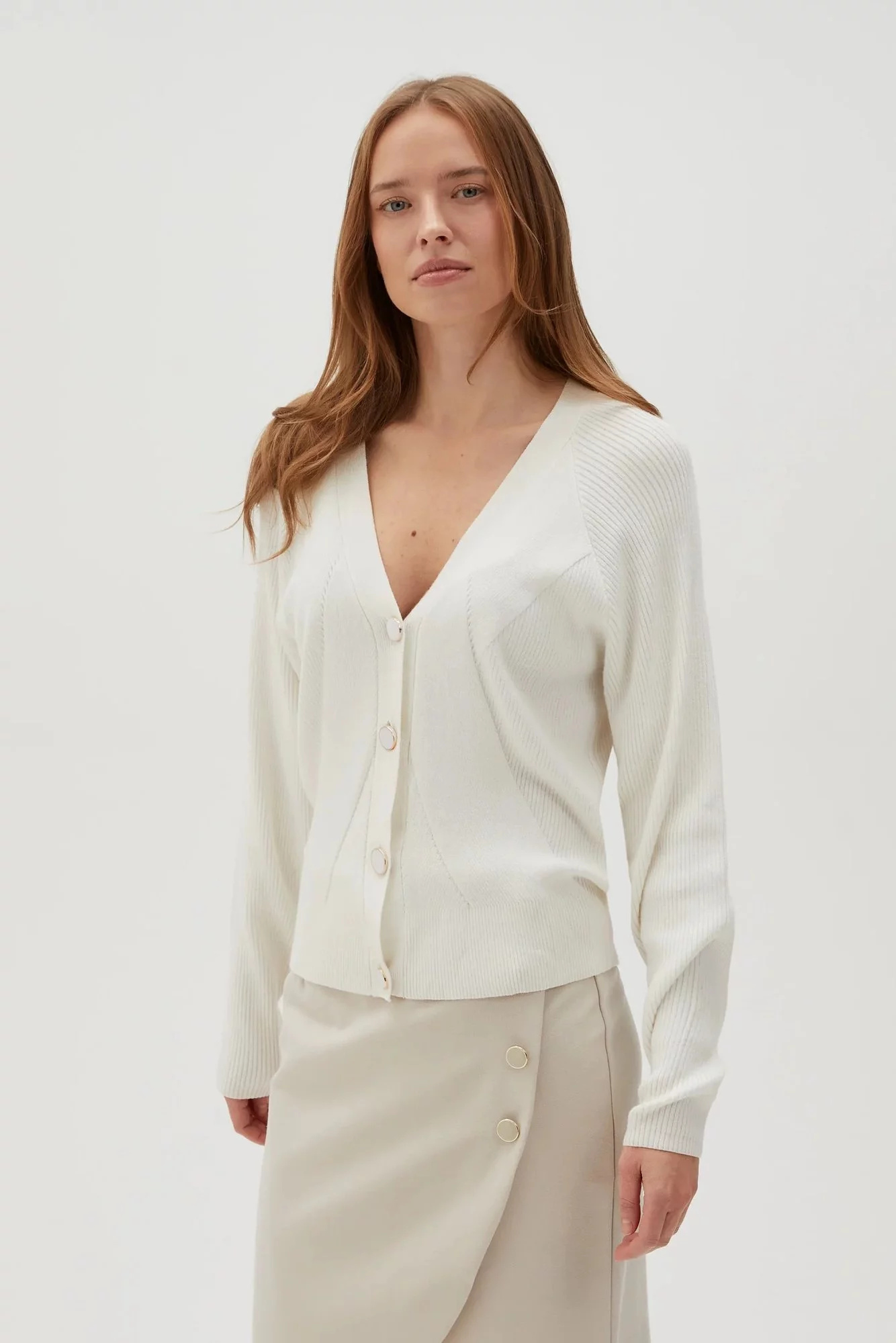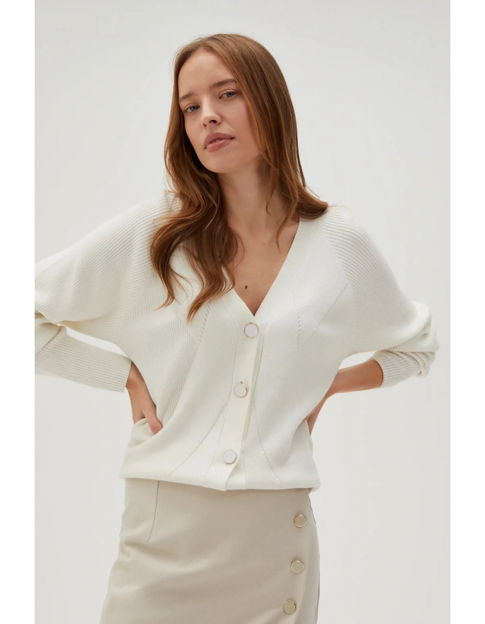 80% VISKÓZA, 20% POLYAMID Krémový dámský svetr je stále jedním z nejžádanějších šatníků. Vyrobeno z vysoce kvalitní viskózy, zajišťuje pohodlí při nošení a měkkost materiálu. Díky strukturálnímu žebrovému vzoru a klasickému střihu cardigan působí elegantně a stylově. Knoflíky dodávají kouzlo a dlouhé rukávy vás zahřejí v chladnějších dnech. Tento krémový ecru svetr je ideální pro mnoho příležitostí - jak pro každodenní, tak pro obchodní jednání nebo večerní výlety. Skvěle se bude hodit k džínům, sukni nebo elegantním kalhotám. Díky své univerzální barvě a nadčasovému designu se stane důležitým prvkem vašeho šatníku.