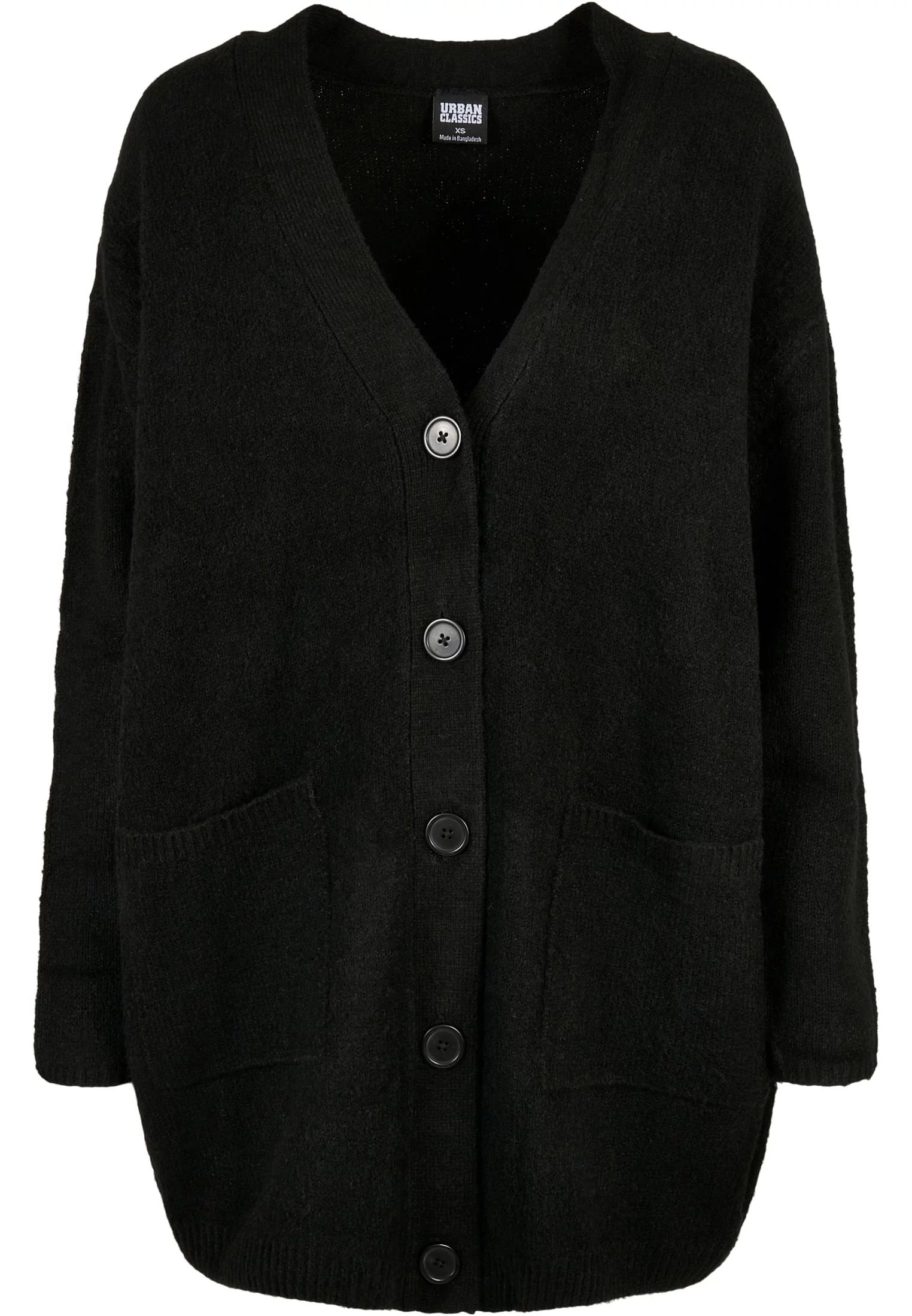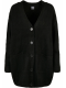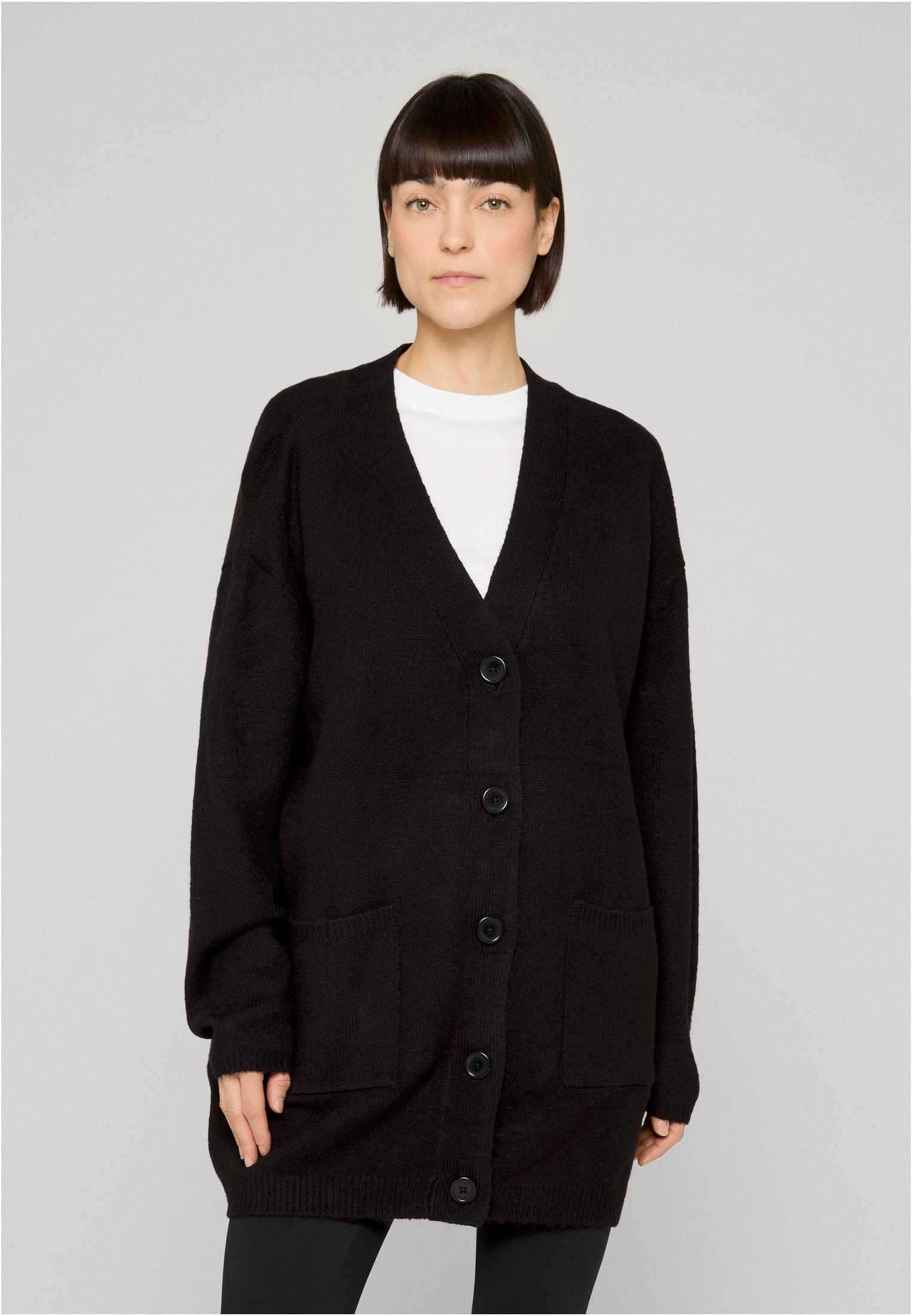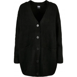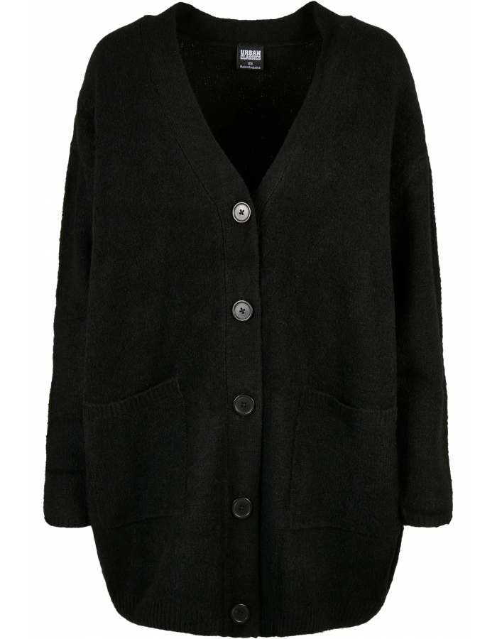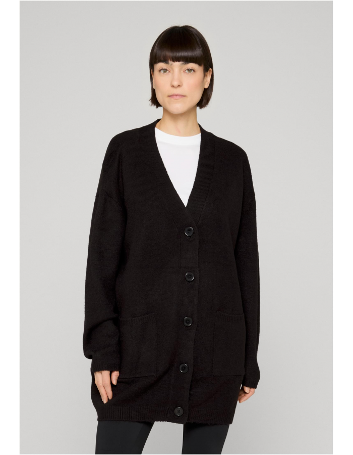 Tento hladký dámský pletený kardigan charakterizuje ženský a jemný vzhled. Materiál z polyakrylu a polyesteru skvěle kontrastuje s ležérním širokým oversize střihem a dlouhou knoflíkovou légou s velkými knoflíky a dvěma našitým kapsami. Trendy úpletová vesta je navíc vybavena dlouhými spadlými rukávy a výstřihem do V. Úzké žebrované manžety a mírně široký žebrový lem dotvářejí vzhled kardiganu.