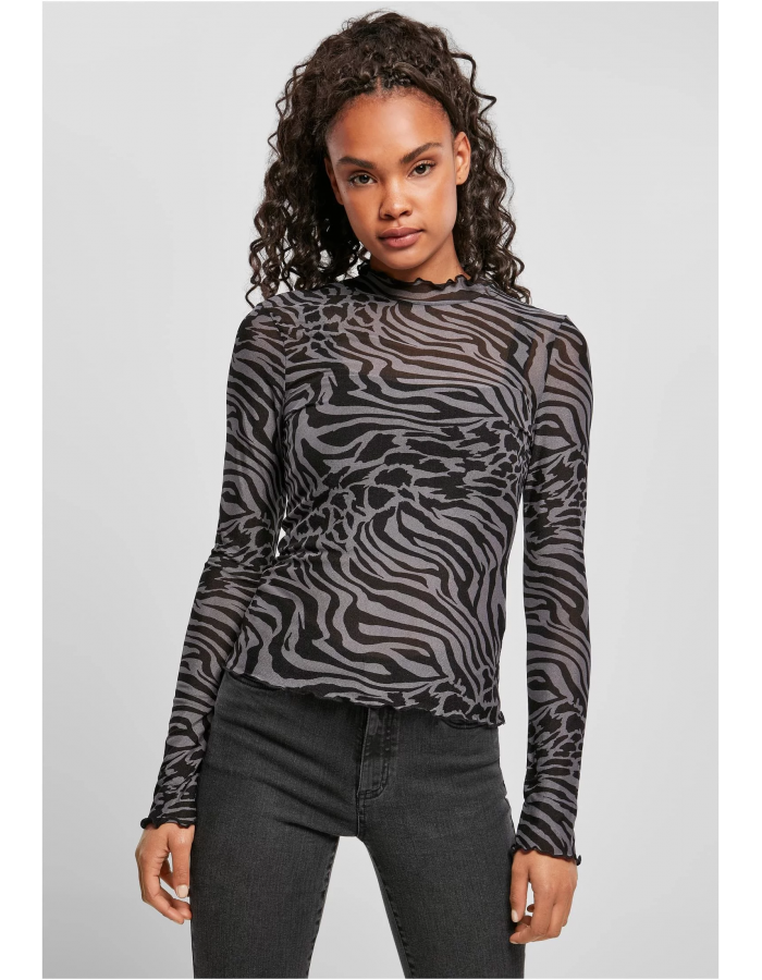 Tato vzrušující dámská košile s dlouhým rukávem poskytuje částečně průhlednou síťovinu a vzrušující celoplošný potisk. Top navíc nabízí lehký rolák a mírně rozšířené rukávy. Lemy jsou hravě zvlněné. Přiléhavý střih s dlouhým rukávem je doplněn spolehlivým polyesterovým materiálem, který je naplněn malým množstvím elastanu pro optimální pohodlí při nošení.