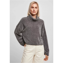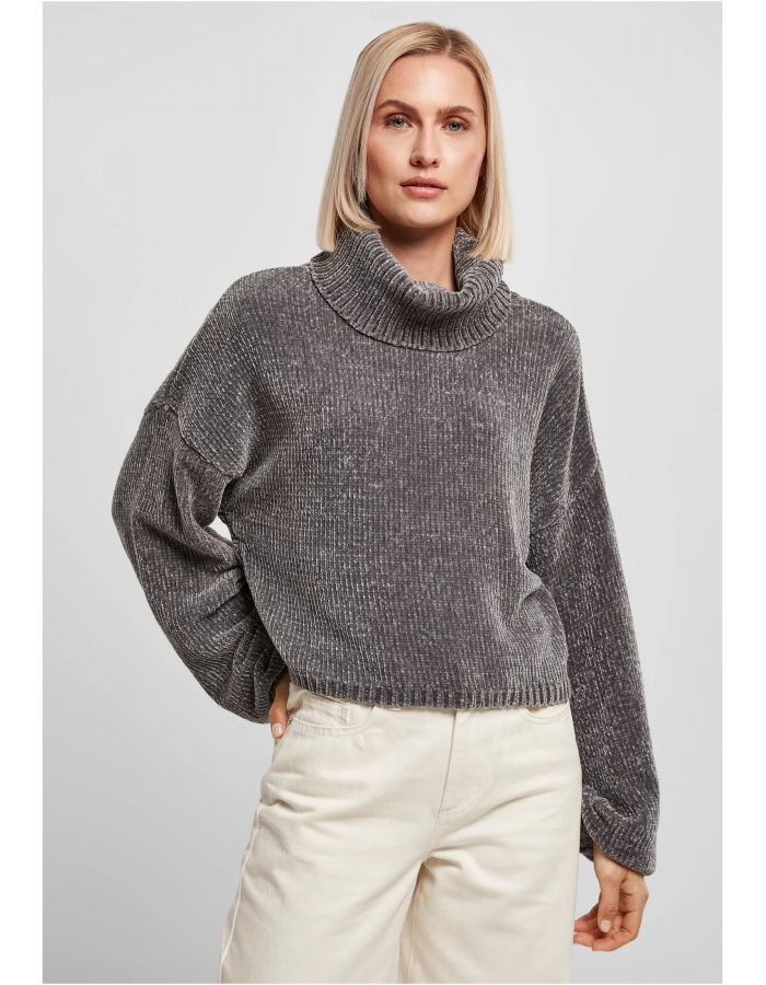 Tento pružný dámský svetr z lesklého žinylkového úpletu je vydařeným módním společníkem a vyznačuje se XXL žebrovaným rolákem a krátkým oversized střihem. Moderní styl svetru završují balonové manžety. Dále je svetr opatřen úzkými žebrovanými manžetami na rukávech a lemu.