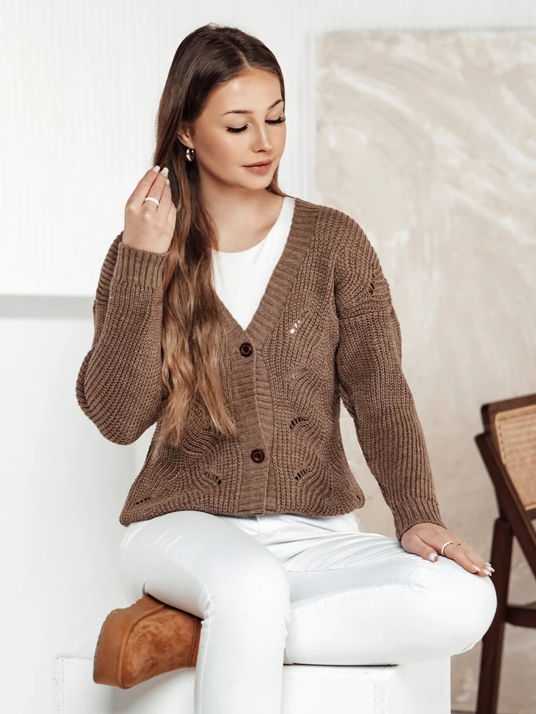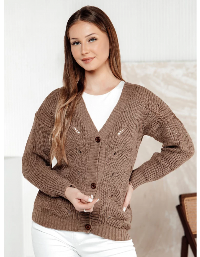Dámský rozepínací svetr s jemnými ažurovými detaily je ideální volbou pro chladnější dny. Vyrobený z měkkého úpletu zajišťuje pohodlí a styl. Klasické knoflíky mu dodávají eleganci a univerzální střih zajišťuje, že se skvěle hodí jak k běžným, tak i k formálnějším stylizacím.