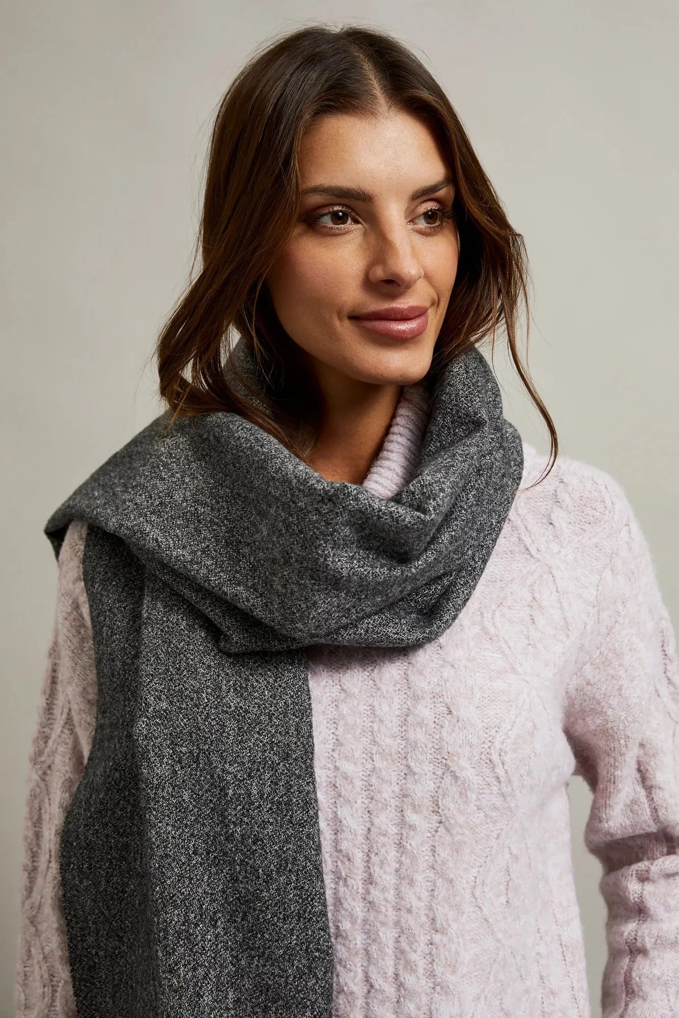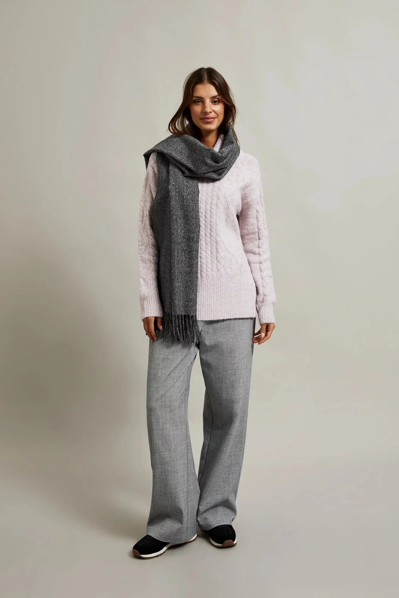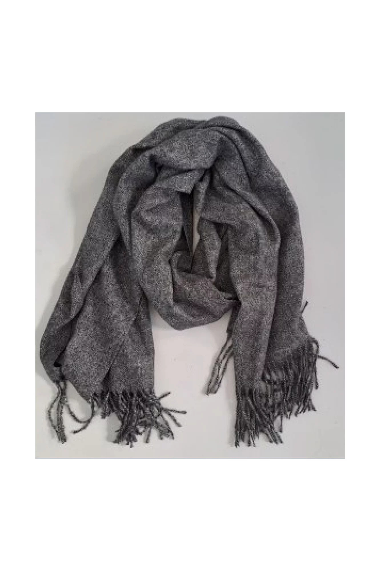 50% POLYESTER, 40% VISKÓZA, 10% METALICKÁ NIT Dámský šátek v grafitové barvě je ideálním doplňkem k jakémukoliv outfitu. Vyrobený z měkkého melírovaného materiálu s třásněmi na koncích, zajišťuje pohodlí při nošení a dodává eleganci. Tato šála bude skvělou volbou na chladnější dny, chránící před větrem a chladem. Dokonale se hodí jak k běžným, neformálním stylizacím, tak i k elegantnějším outfitům. Lze jej nosit jak s kabátem, tak se svetrem nebo bundou.