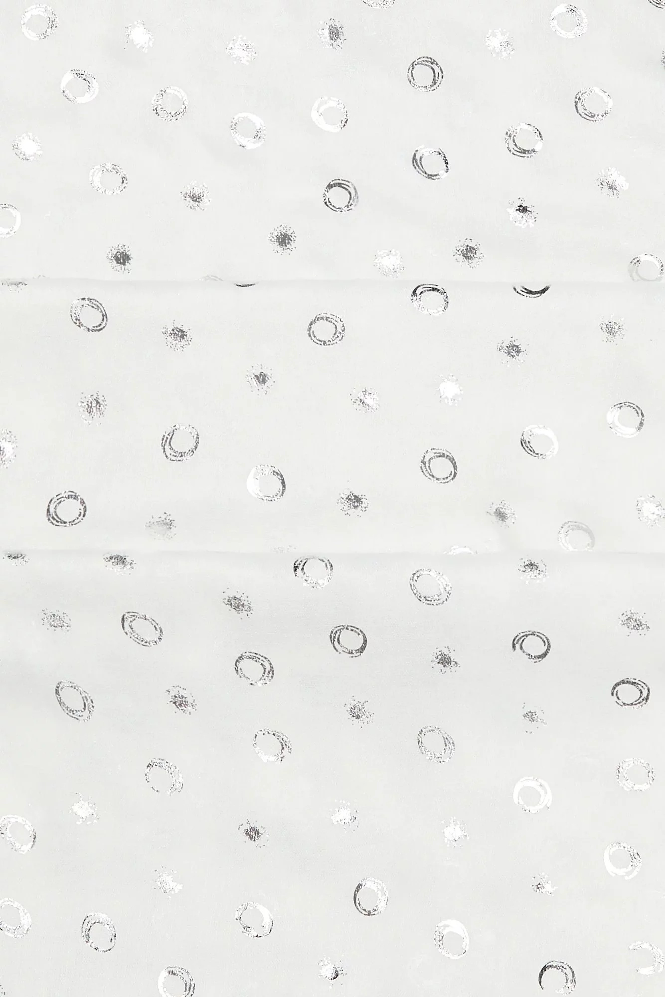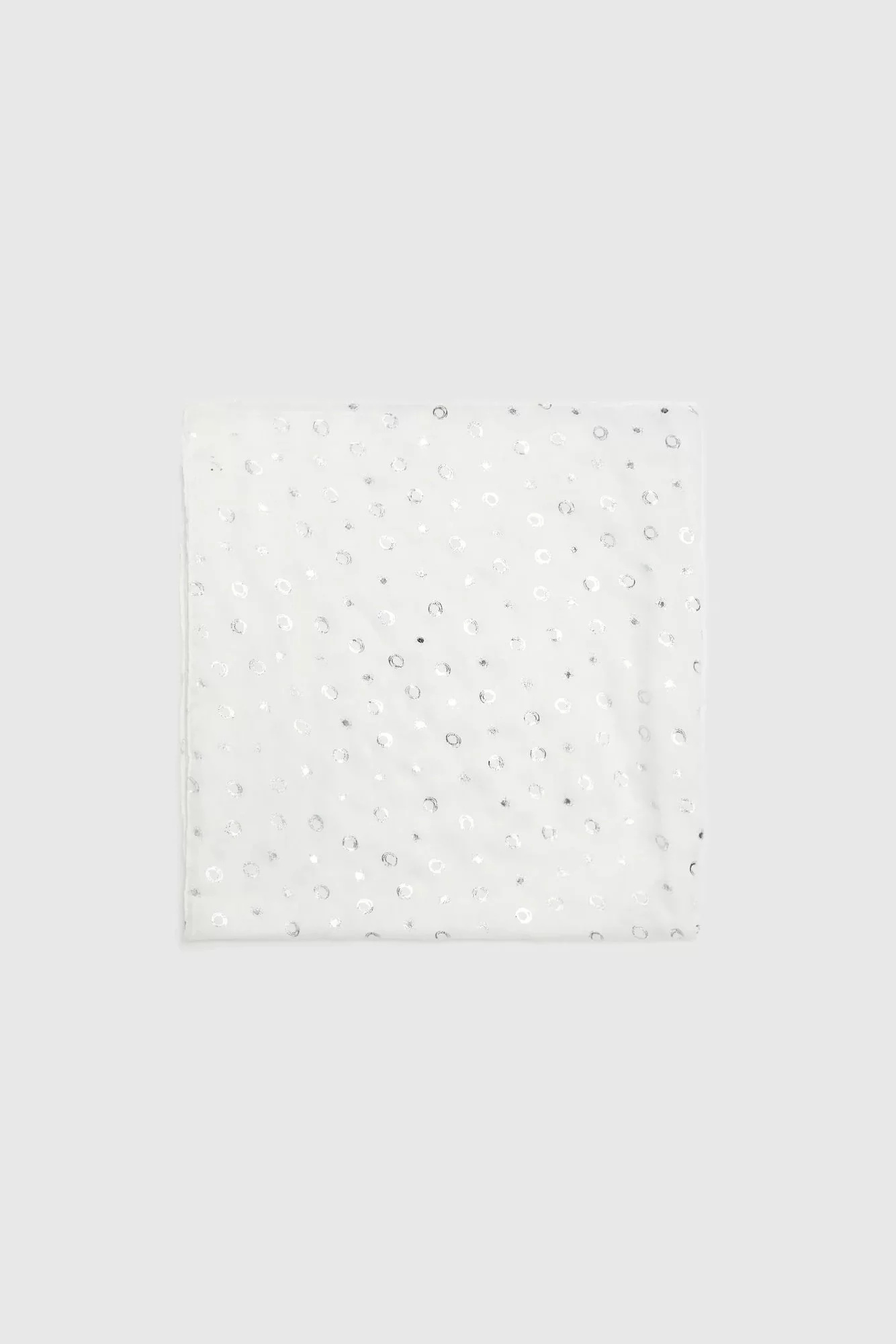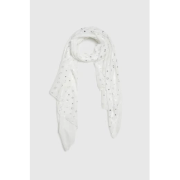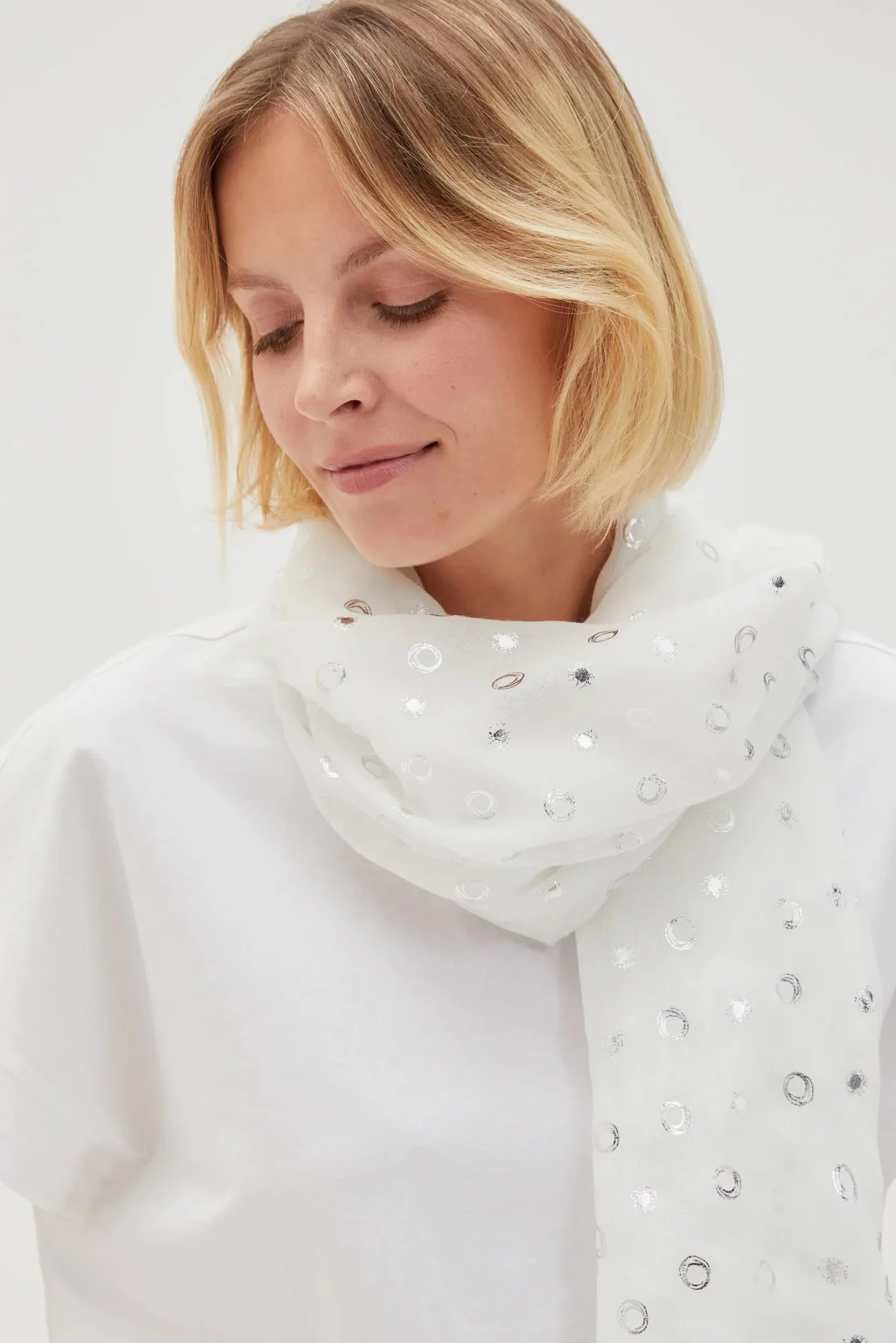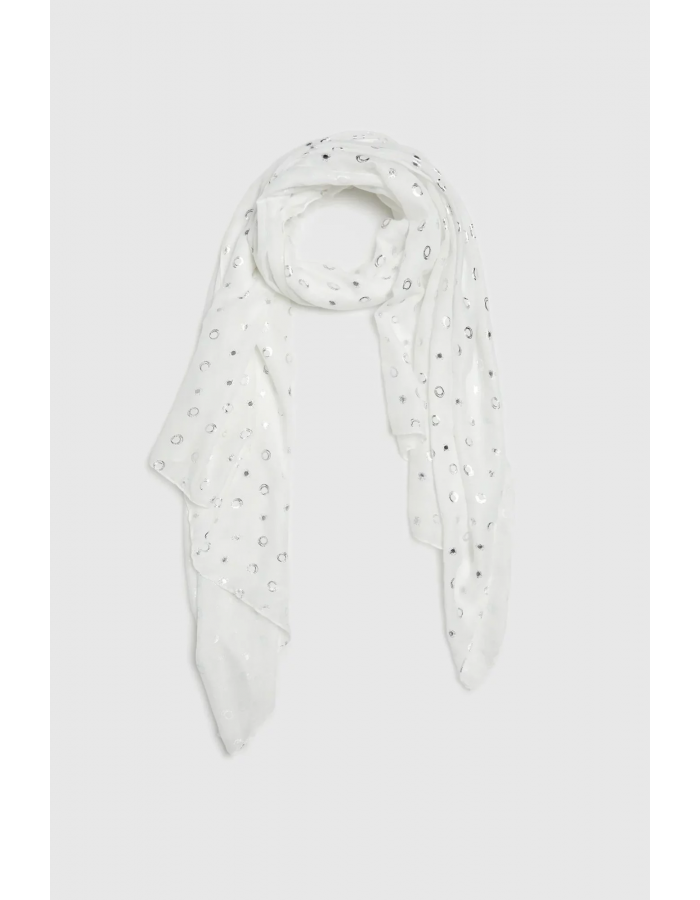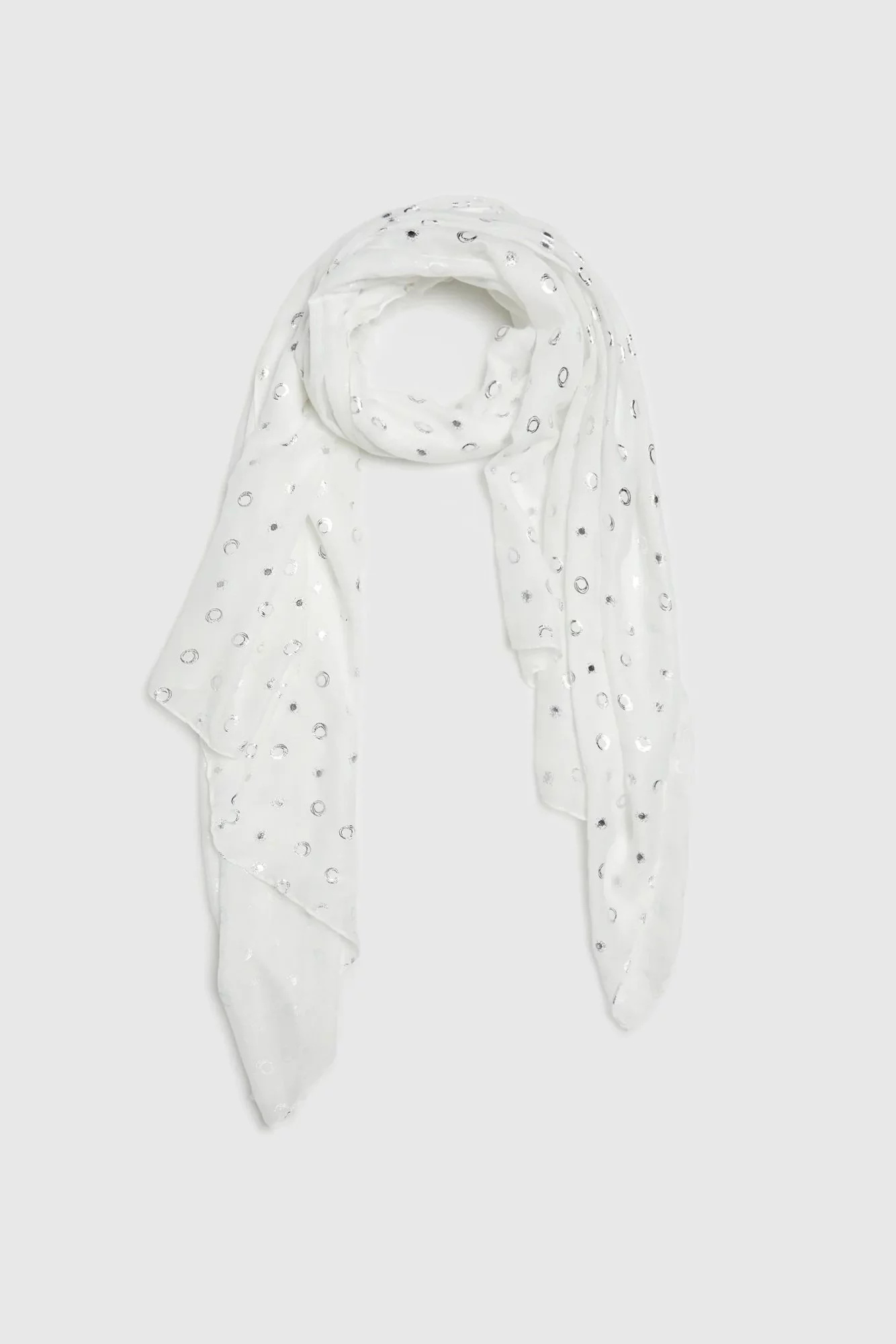 100% POLYESTER Bílá šála se stříbrným potiskem je mimořádně stylovým doplňkem, se kterým se každá žena bude cítit výjimečně. Vyrobeno z vysoce kvalitních materiálů, má metalický potisk, který dodává eleganci a lesk. Tento jedinečný šátek je ideální pro mnoho příležitostí a dodává lesk a šik každému stylu. Dá se nosit jak každý den, tak i na formálnější příležitosti. Skvěle se hodí k jednoduchému jednobarevnému oblečení, které mu umožní získat pozornost a stát se hlavním prvkem outfitu.
