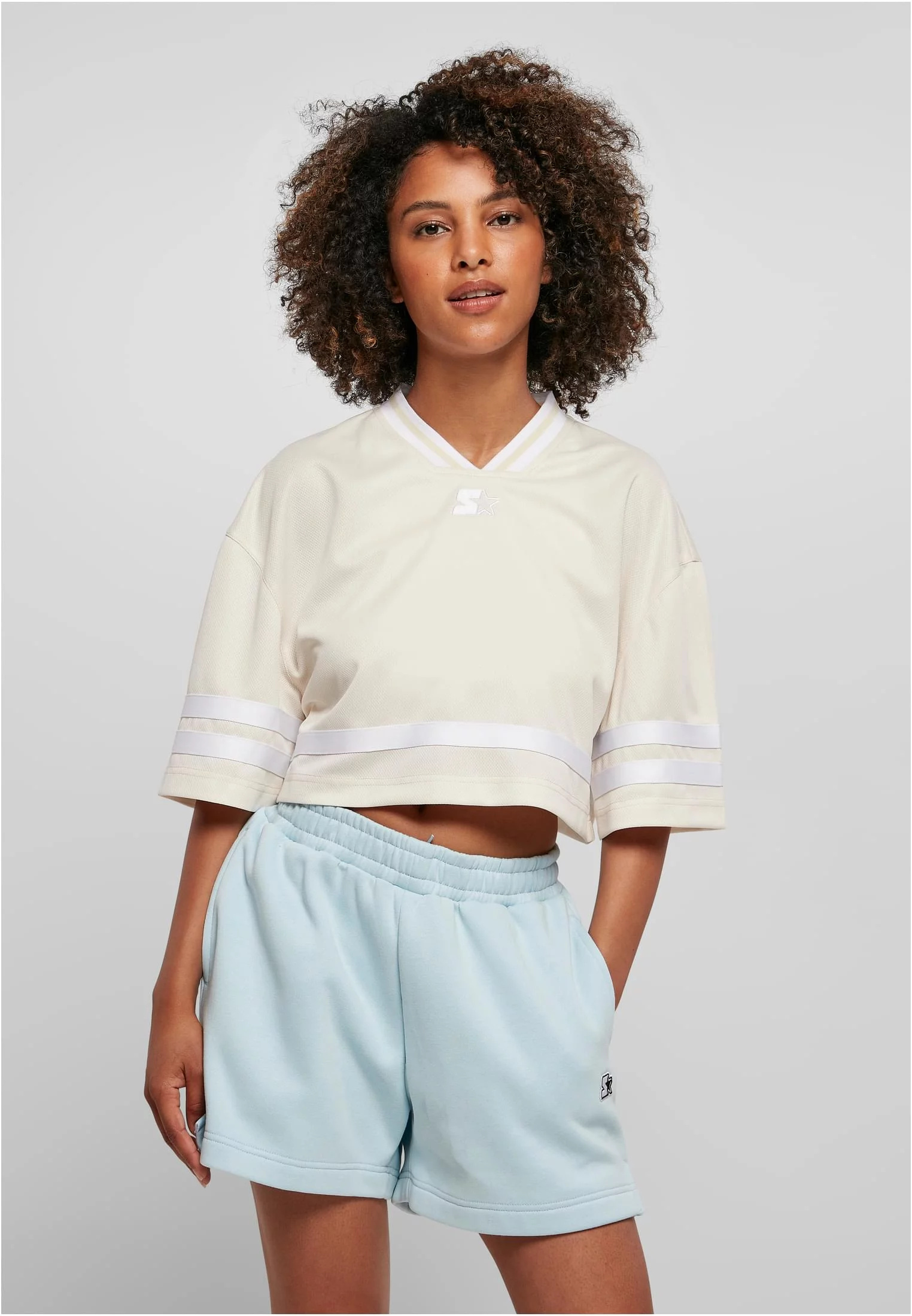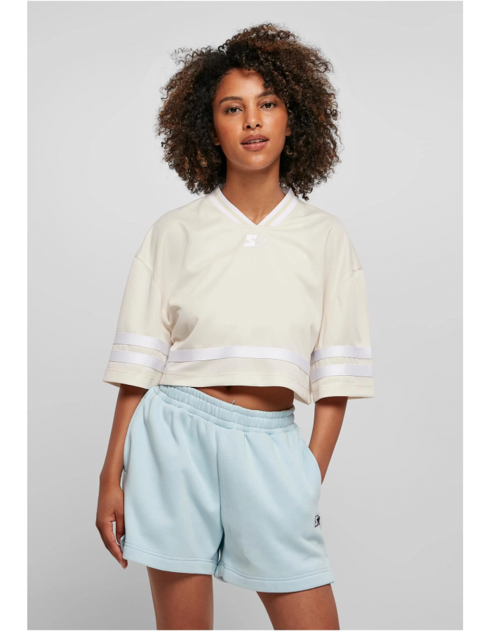 Tato zářivá dámská košile je inspirována atletickým vysokoškolským stylem a zušlechťuje jej ženskými detaily. Výstřih do V a široké rukávy po lokty mají dvojité pruhy, lem je rovněž lemován pruhem. Počáteční branding tvoří dvě malá loga Starter pod výstřihem – výšivka vpředu a potisk vzadu – a dále malé tkané logo nad levým lemem. Dámská košile je zkrácený břišní top. Díky oversize střihu s bohatě spadlými rameny je nošení opravdu příjemné. Dres je vyroben z třpytivé síťoviny.