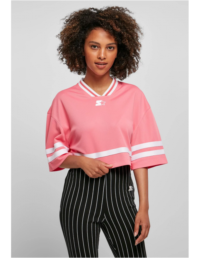 Tato zářivá dámská košile je inspirována atletickým vysokoškolským stylem a zušlechťuje jej ženskými detaily. Výstřih do V a široké rukávy po lokty mají dvojité pruhy, lem je rovněž lemován pruhem. Počáteční branding tvoří dvě malá loga Starter pod výstřihem – výšivka vpředu a potisk vzadu – a dále malé tkané logo nad levým lemem. Dámská košile je zkrácený břišní top. Díky oversize střihu s bohatě spadlými rameny je nošení opravdu příjemné. Dres je vyroben z třpytivé síťoviny.