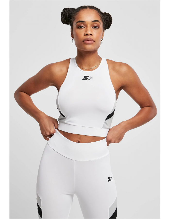 Sportovní dámský top umožňuje díky racerback střihu bez ramínek dostatek volnosti pohybu, kterou ještě více umocňuje použitý strečový žerzejový materiál. Barevné vsadky po stranách a dva malé potisky loga Starter kolem výstřihu dodávají styl. Dámský top je sexy krátkého střihu.