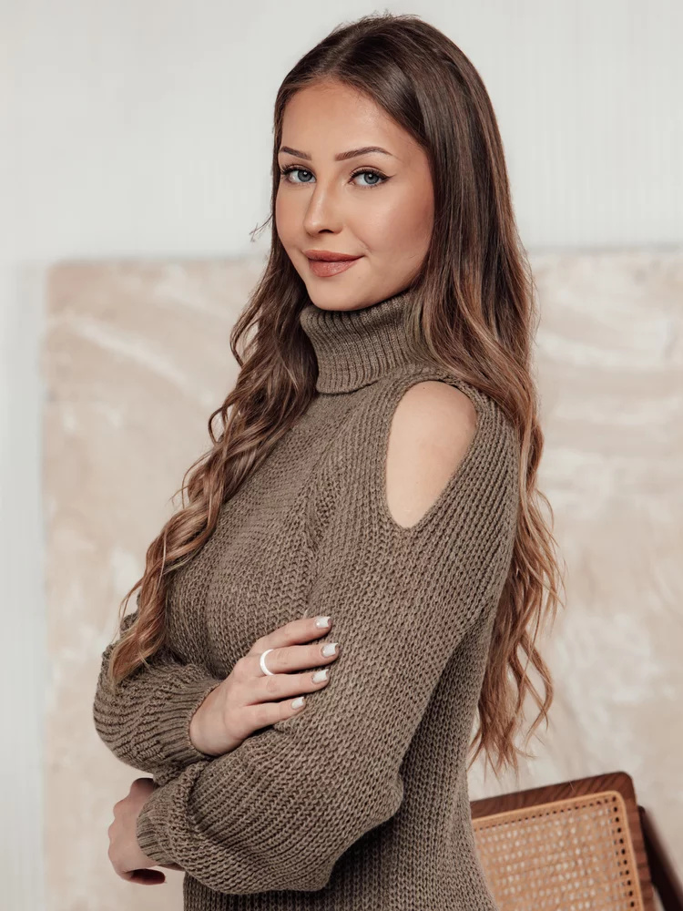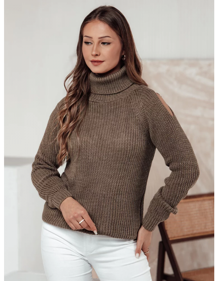 Dámský svetr s rolákem a jemnými výřezy na ramenou. Měkký úplet zajišťuje pohodlí a teplo v chladných dnech. Ideální pro ležérní stylizace, ale hodí se také do elegantních kombinací. Klasický design s nádechem modernosti.