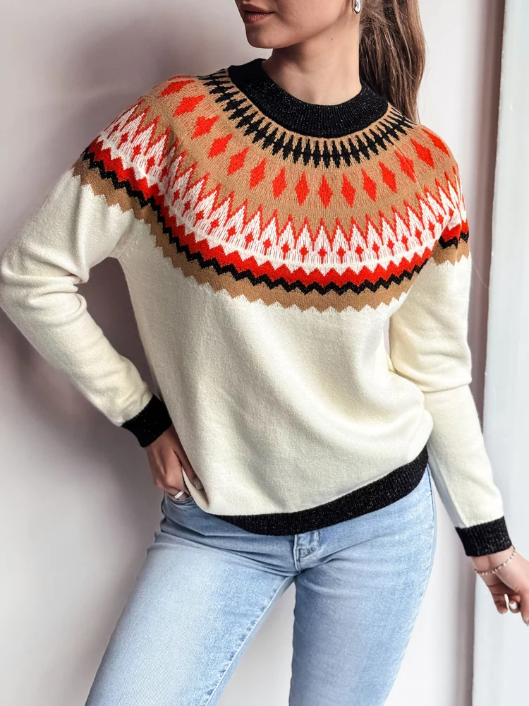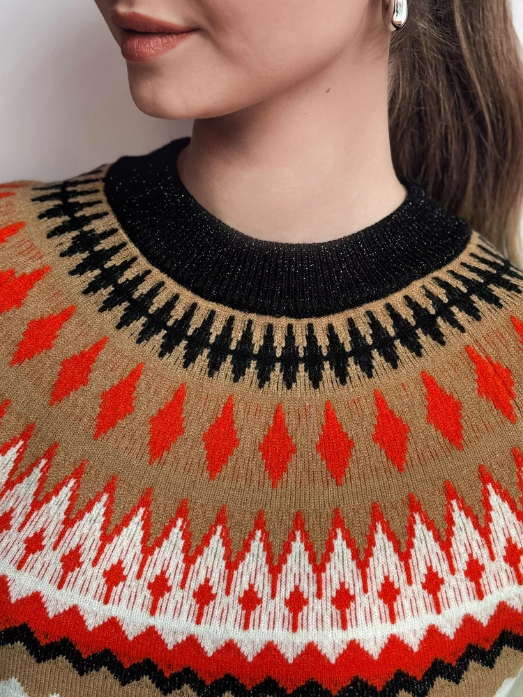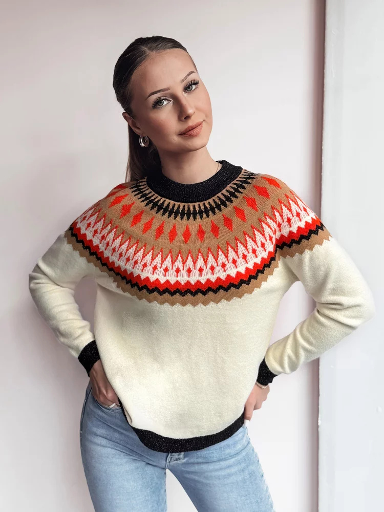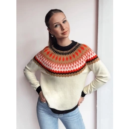 Teplý svetr s unikátním vzorem ve skandinávském stylu, ideální na chladnější dny. Měkký a příjemný na dotek materiál zajišťuje pohodlí při nošení a nadčasový design se skvěle hodí k džínům nebo sukním. Dokonalá volba pro milovnice elegance a pohodlí.