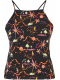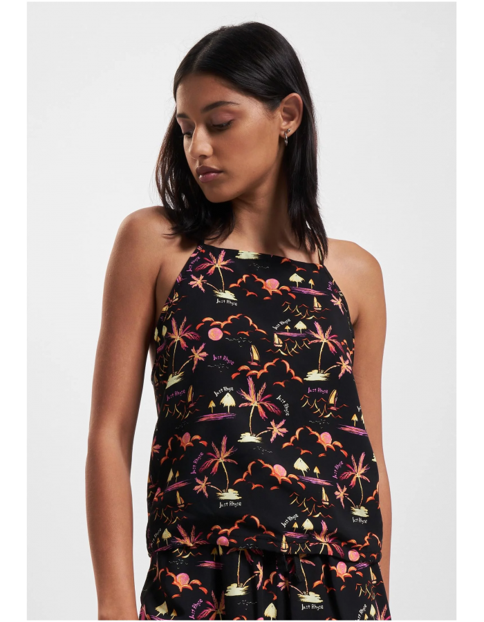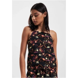 Top s halter výstřihem, který má výrazný tropický vzor. Vzor obsahuje motivy palem, slunce, plachetnic a mraků v živých barvách, jako jsou růžová, oranžová a žlutá, což vytváří letní a exotický vzhled. Tento top je ideální pro teplé počasí a působí velmi svěže a stylově. Halter výstřih přidává elegantní nádech a odhaluje ramena, což topu dodává ženskost a moderní vzhled. Top lze skvěle kombinovat s lehkými kalhotami nebo šortkami pro pohodový letní outfit.