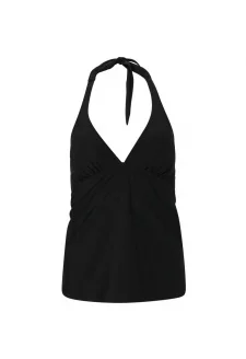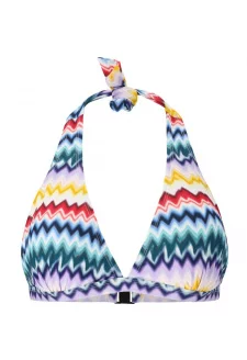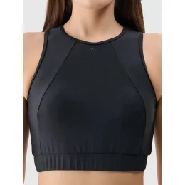 Vrchní díl má sportovní střih s vysokým kulatým výstřihem a širokou elastickou gumou pod prsy pro maximální pohodlí a podporu.
