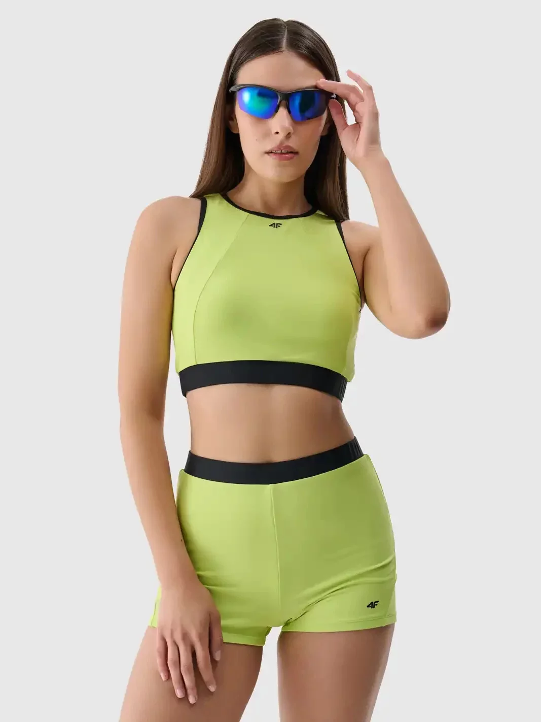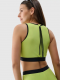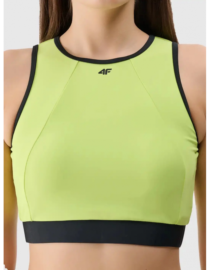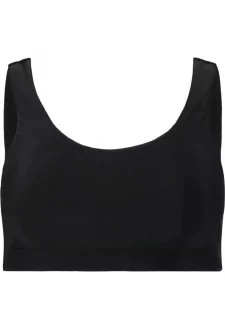 Vrchní díl má sportovní střih s vysokým kulatým výstřihem a širokou elastickou gumou pod prsy pro maximální pohodlí a podporu.
