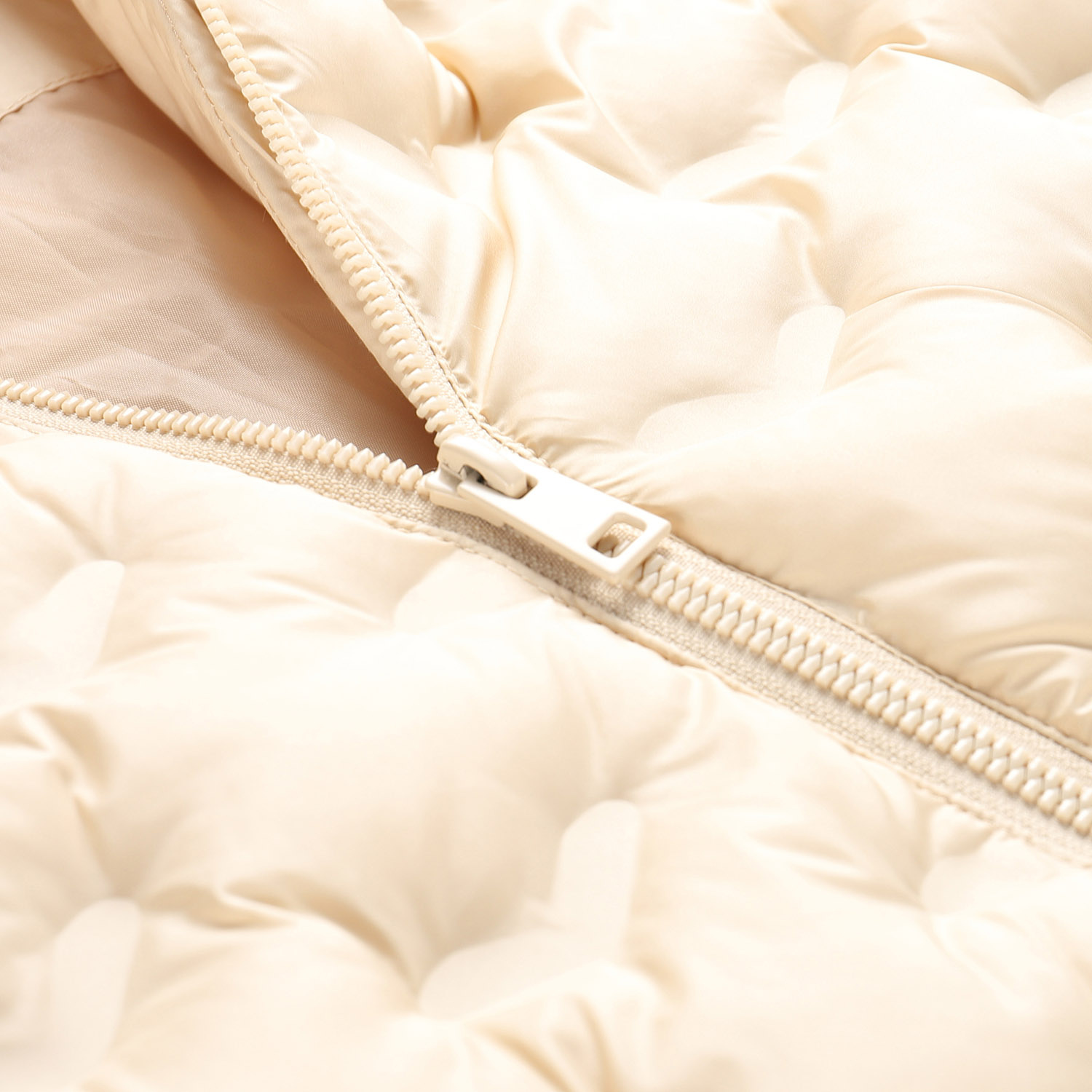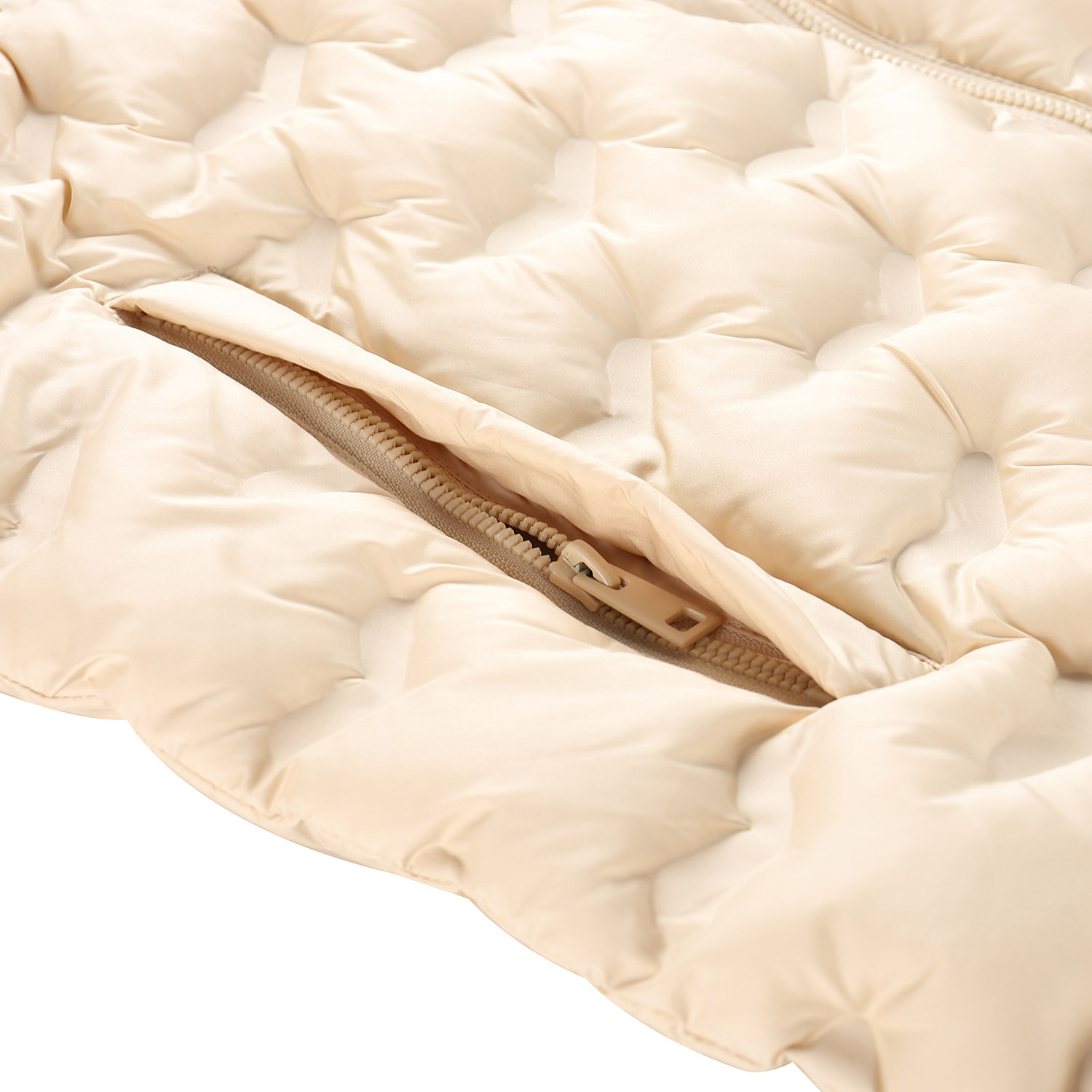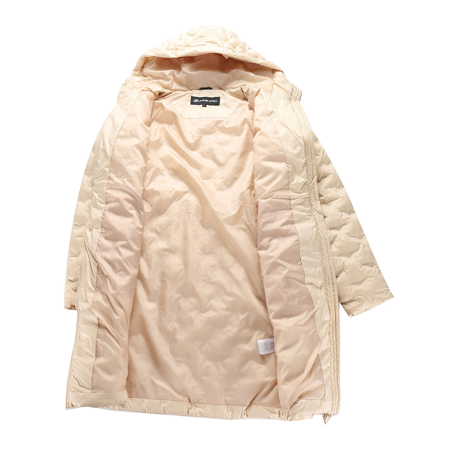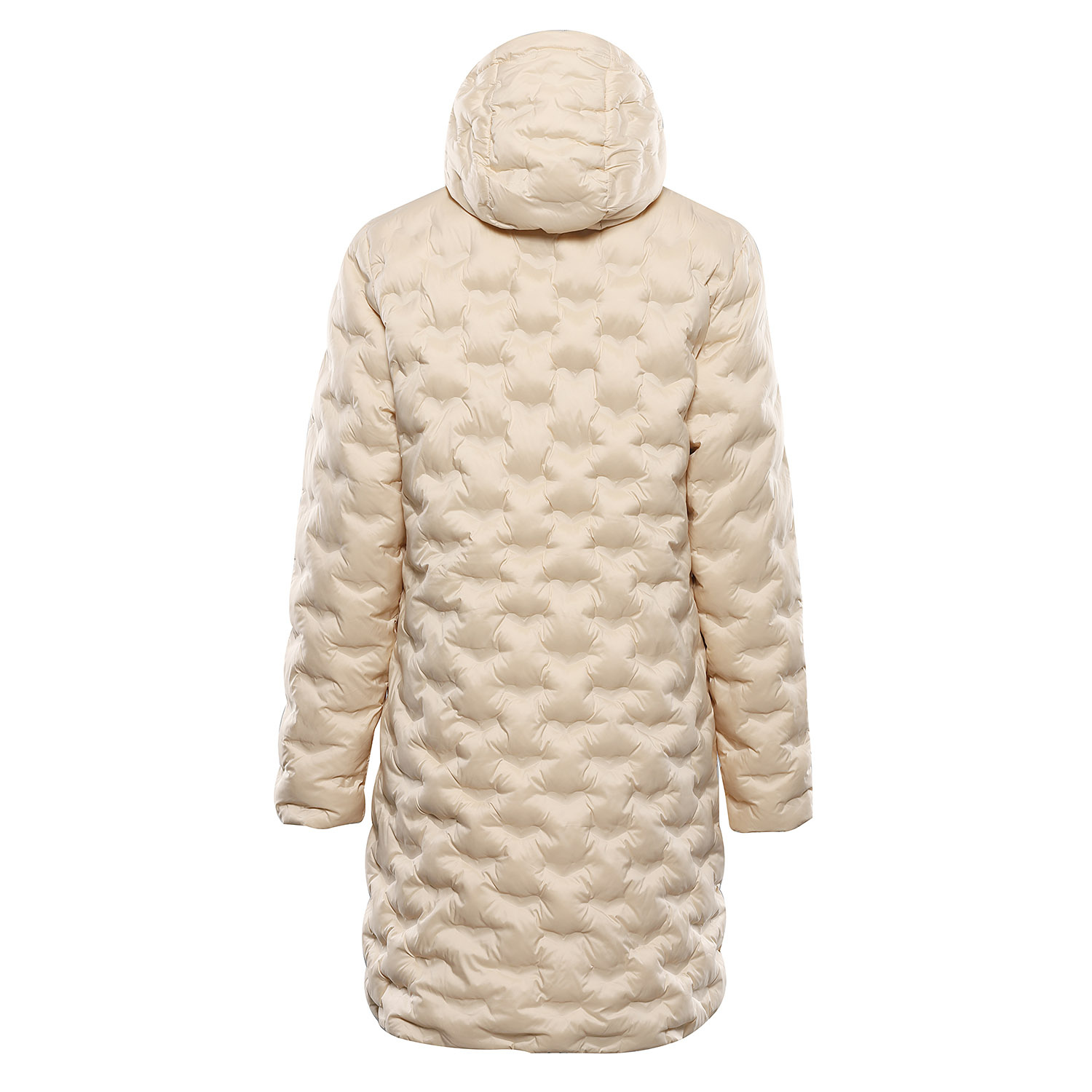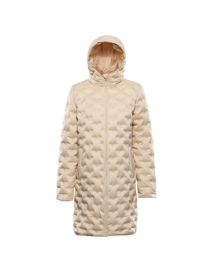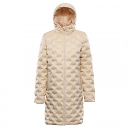 Kabát je dlouhý, prošívaný a embosovaný, vyroben z vodoodpudivého a ultralehkého materiálu se zátěrovou úpravou, která chrání proti vlhkosti a zajišťuje pohodlí při nošení ve městě i v přírodě. Střední hřejivá výplň udržuje příjemné teplo, zatímco volný HI-THERM střih poskytuje dostatek prostoru pro vrstvení oblečení a neomezuje pohyb. Neodepínatelná kapuce chrání před větrem a sněhem, dvě praktické kapsy nabízejí prostor pro osobní věci a nášivka na rukávu dodává kabátu stylový a moderní vzhled.