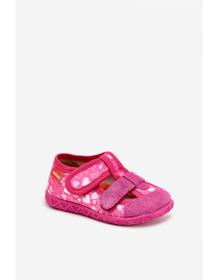 Růžové dětské papuče Reathiana se vzorem srdíček a praktickým zapínáním na suchý zip jsou měkké a pohodlné. Ideální pro domácí nošení, zajišťují dětem volnost pohybu a bezpečí při každém kroku.