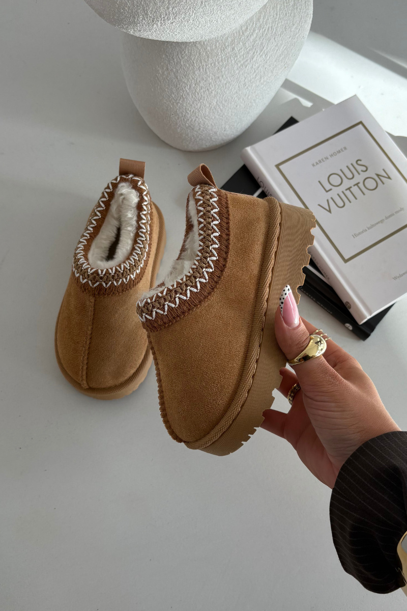 Stylové dětské sněhule Prina v camel odstínu s jemnou výšivkou kombinují moderní design a pohodlí. Teplé zateplení udrží nožičky v teple i během chladných zimních dní, zatímco lehká a flexibilní podrážka zajišťuje bezpečný a stabilní krok.