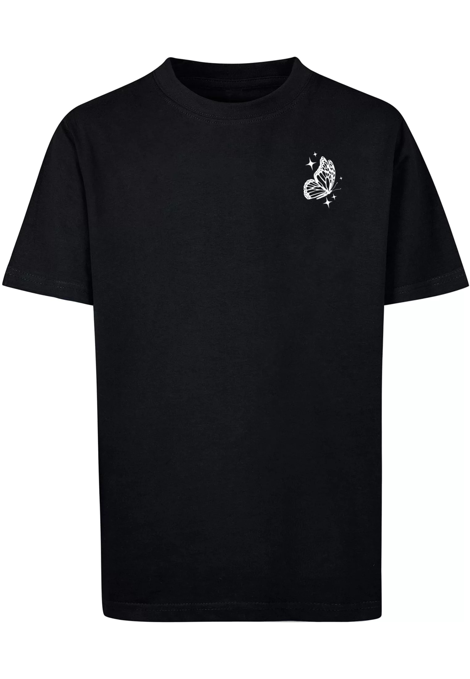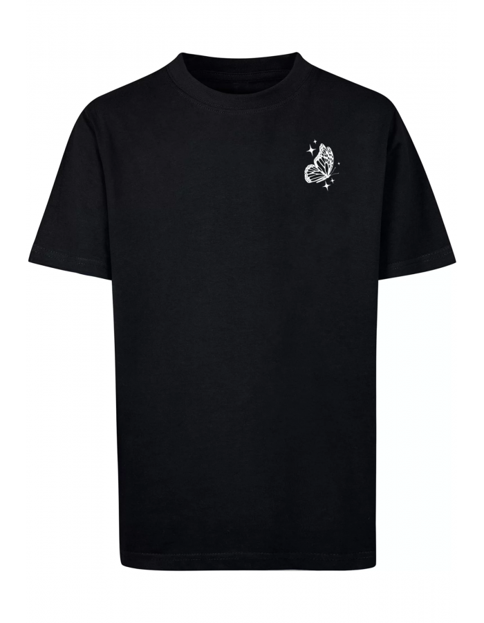 Na levé straně hrudi je malý motiv bílého motýla s jemnými třpytkami kolem něj. Tento minimalistický design dodává tričku jemný, ale elegantní vzhled. Na zadní straně trička je větší motiv s několika bílými motýly a textem "Beyond your wildest Dreams" (česky "Za tvými nejdivočejšími sny"). Motýli i text jsou doplněny hvězdičkami a třpytkami, které celkový design zjemňují a dodávají mu snový vzhled. Celkově tričko působí moderně a stylově, ideální pro každodenní nošení s nádechem osobitosti.