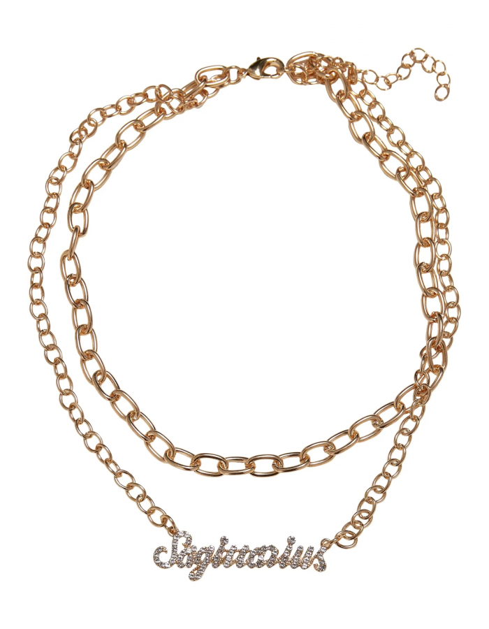 Stylovým vrcholem tohoto dvouřadého unisex náhrdelníku je jeho přívěsek se znamením zvěrokruhu s kurzívou, který je osazen jemnými kamínky. Obě řady jsou kotevní řetězy a jsou vyrobeny ze železa a slitiny zinku. Řetízek je dlouhý 38 cm a doplněn o 7 cm dlouhý prodlužovací řetízek ze zapínání.
