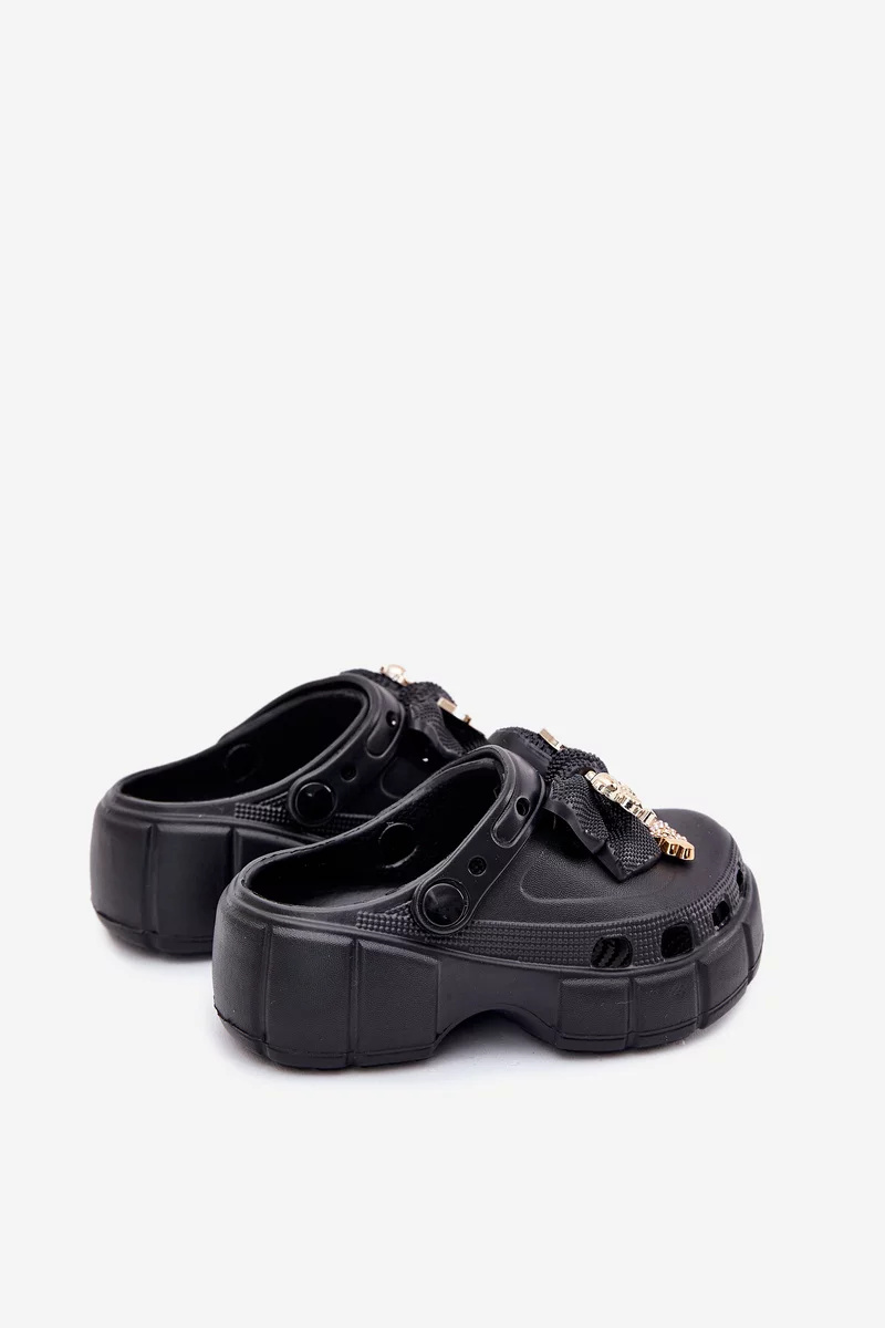Černé pěnové pantofle s mašličkou krásně doplní letní outfit a hodí se i k plavkám nebo šortkám.