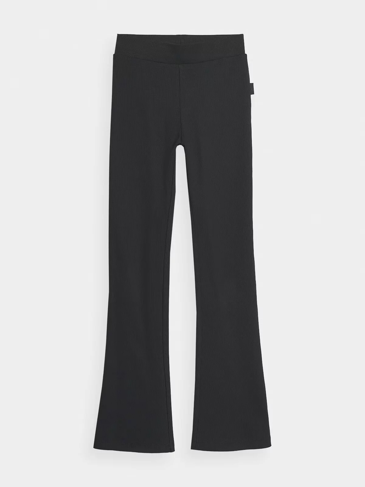 Bez kapes. Elastický pás bez nastavení. Rozšířené nohavice typu flare.