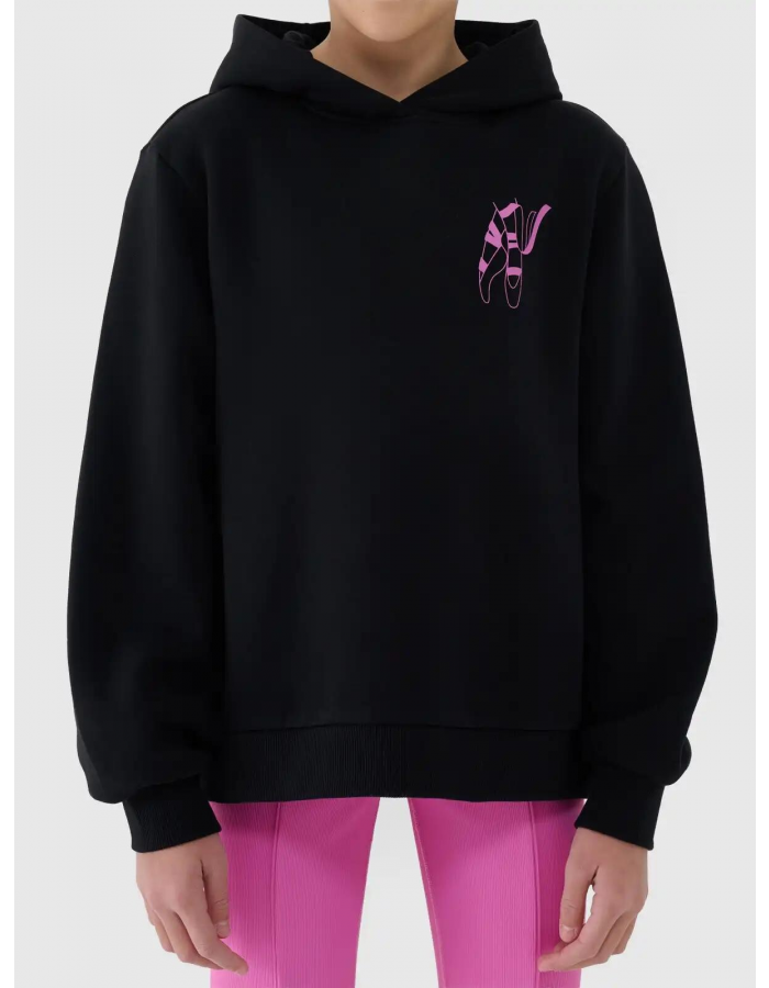 Na přední straně je umístěn originální potisk s motivem baletních špiček, který dodává mikině hravý a dívčí charakter.