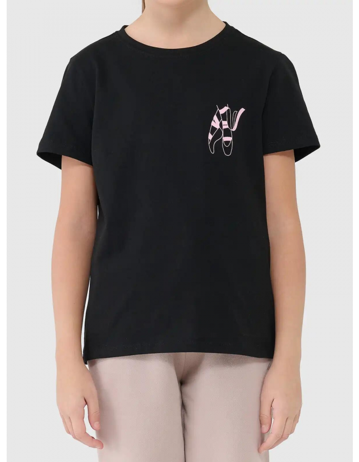 Na přední straně je umístěn originální potisk s motivem baletních špiček, který dodává tričku dívčí a hravý charakter.