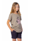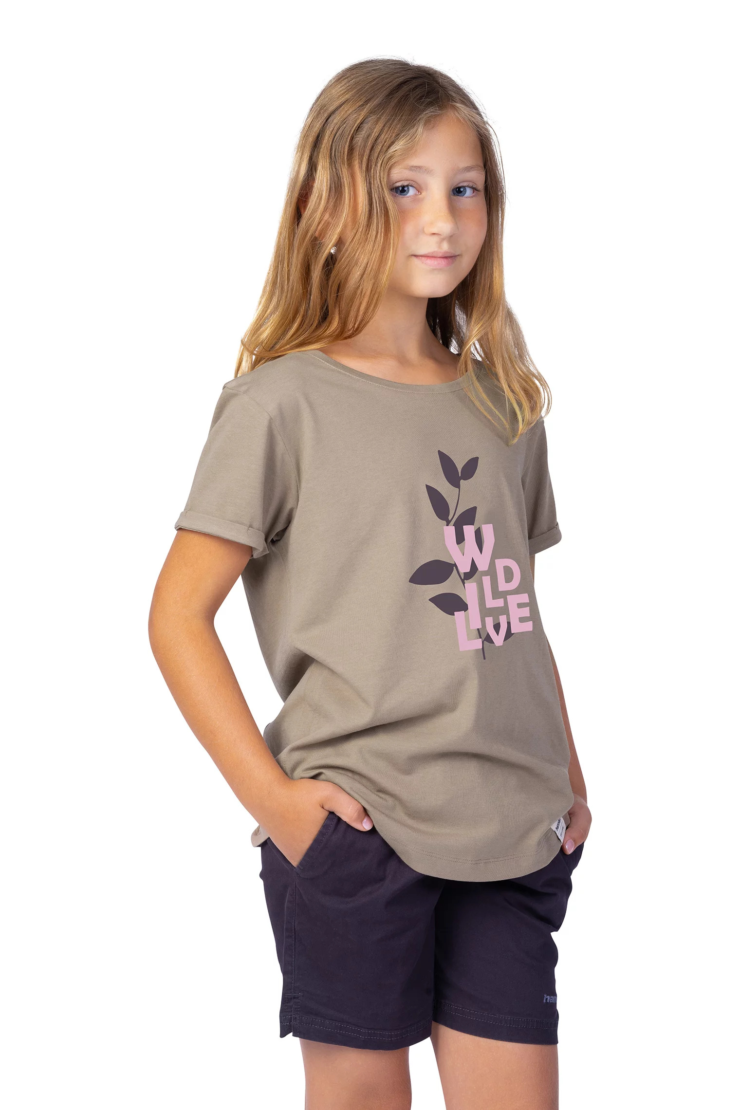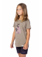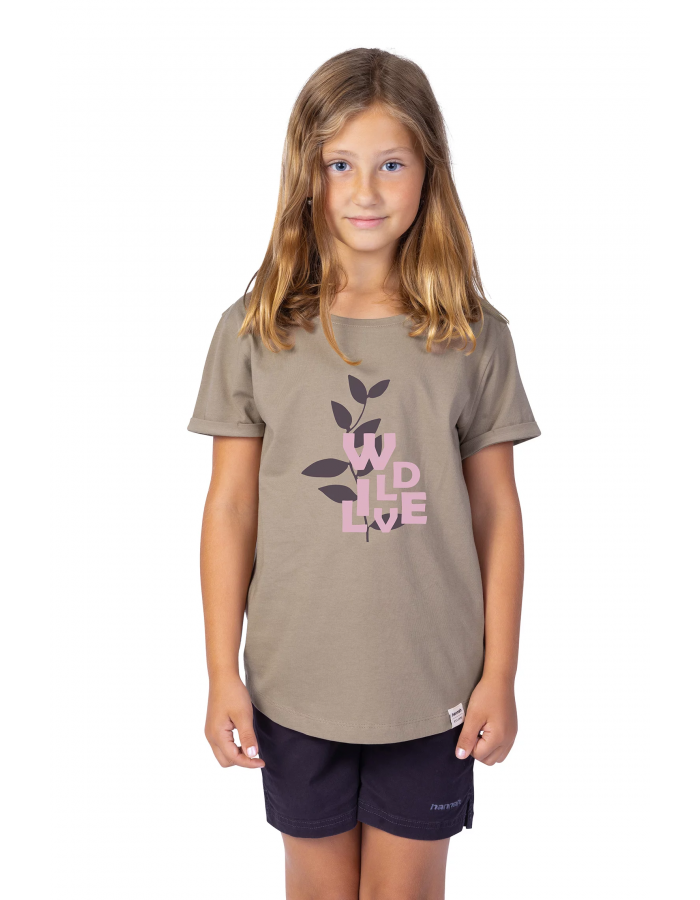 Dětské tričko z přírodního a kvalitního materiálu v polopřiléhavém střihu. Dolní zaoblený přední i zadní okraj trička a dekorativní ohrnutí zakončení krátkých rukávů dokresluje dívčí styl. Decentní print na hrudi.