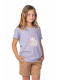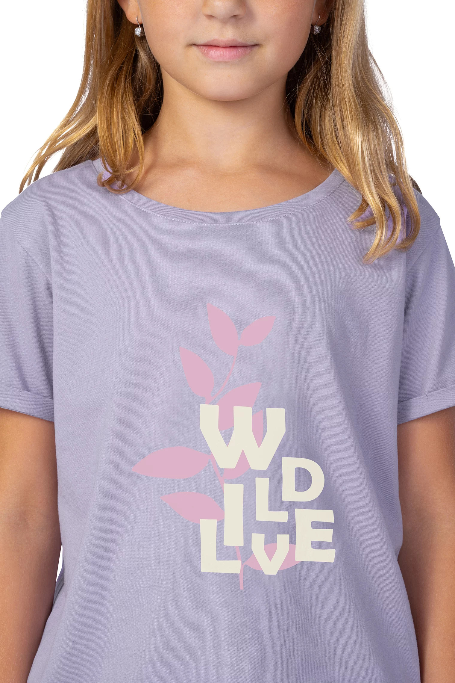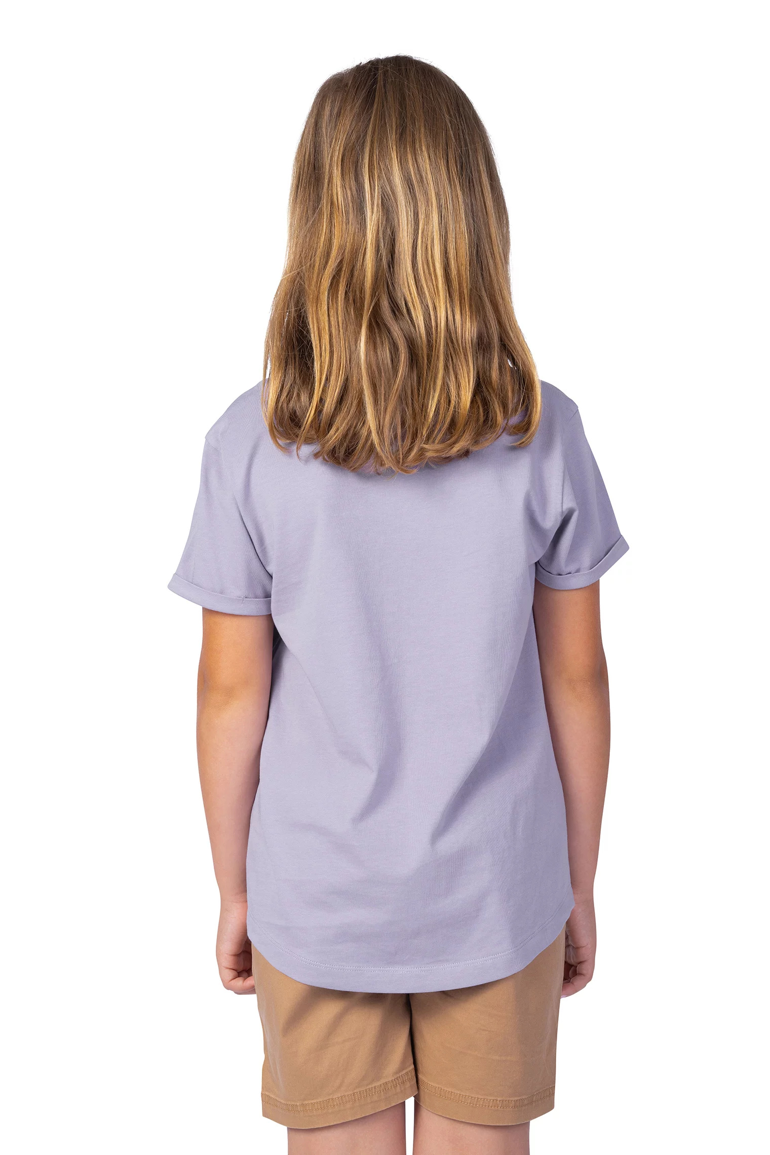 Dětské tričko z přírodního a kvalitního materiálu v polopřiléhavém střihu. Dolní zaoblený přední i zadní okraj trička a dekorativní ohrnutí zakončení krátkých rukávů dokresluje dívčí styl. Decentní print na hrudi.