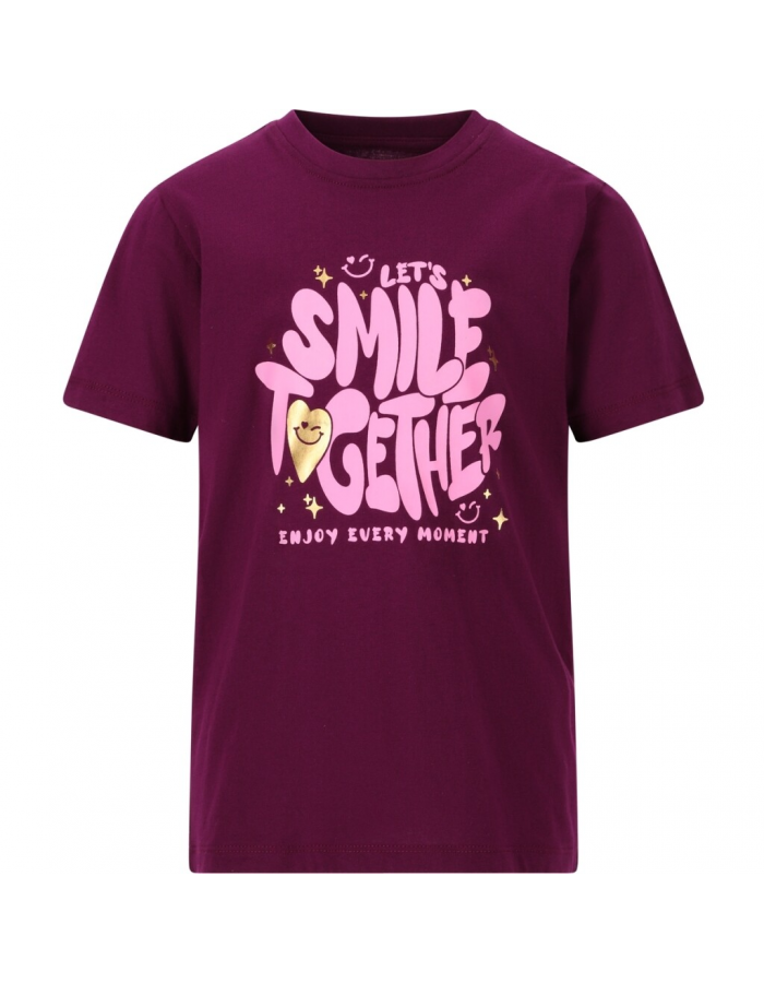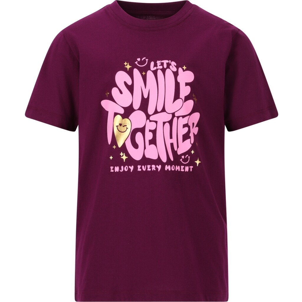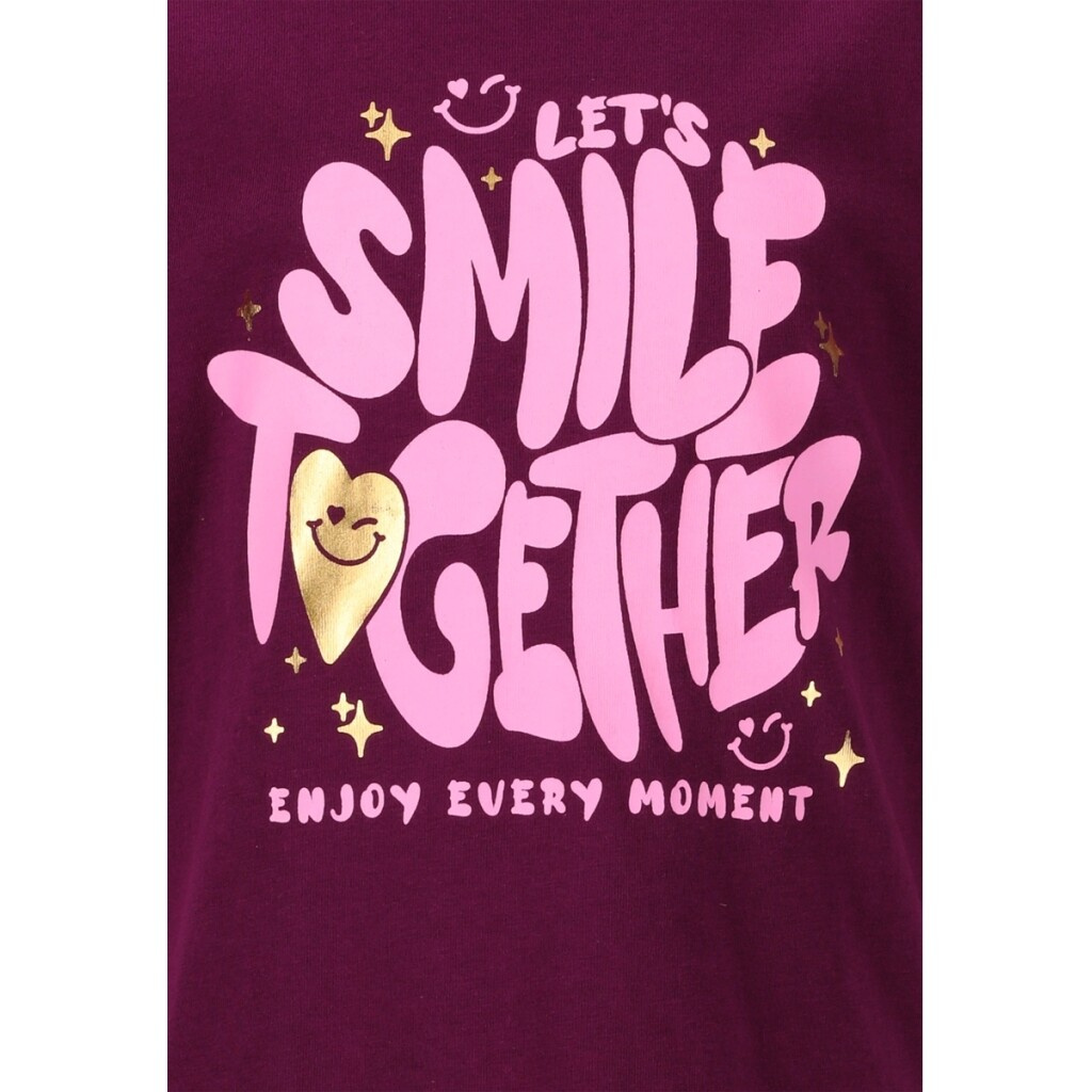 Stylové dětské tričko s veselým nápisem „Let’s Smile Together“ a zlatým srdíčkem vykouzlí úsměv nejen na tváři vašeho dítěte, ale i všech kolem.