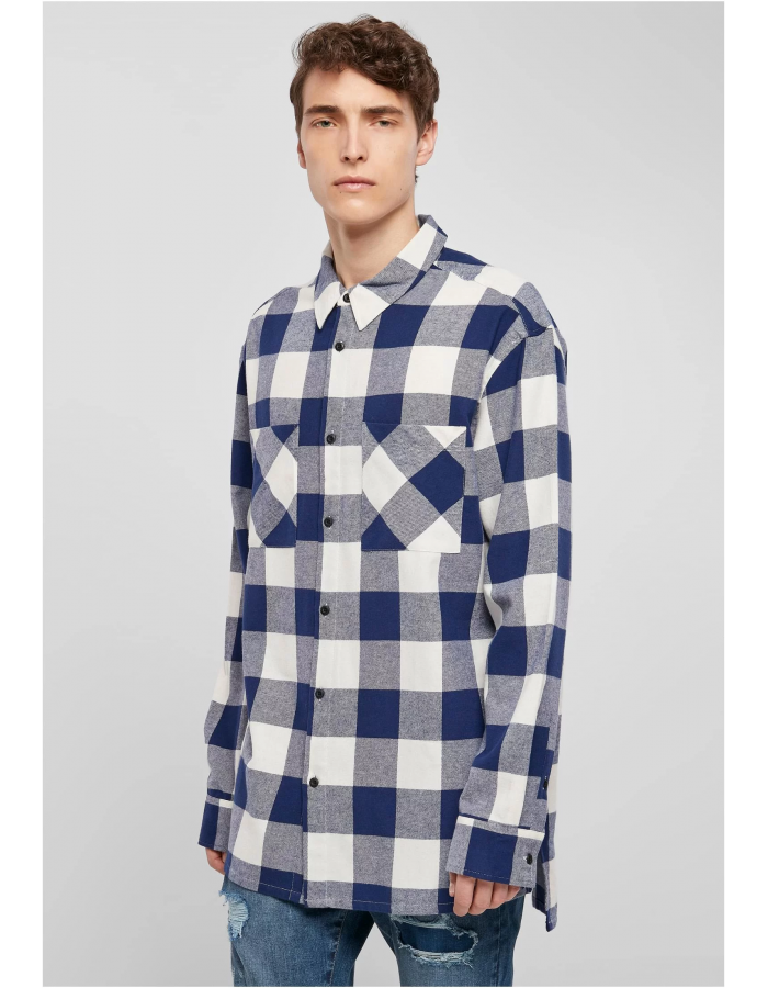 Super ležérní pánská košile oversize střihu a velkorysé délky. Po stranách rozparek a se zadním dílem zcela zakrývajícím hýždě je košile vyrobena z elegantního bavlněného flanelu v tříbarevném kostkovaném vzoru. Mužský styl harmonicky doplňují dvě velké náprsní kapsy, knoflíková léga, stahovací límec a jemné manžety na rukávech.